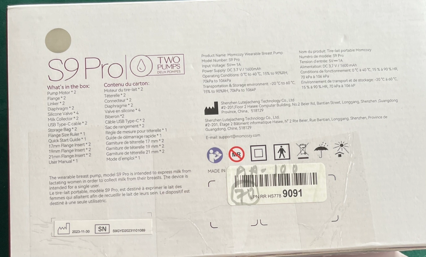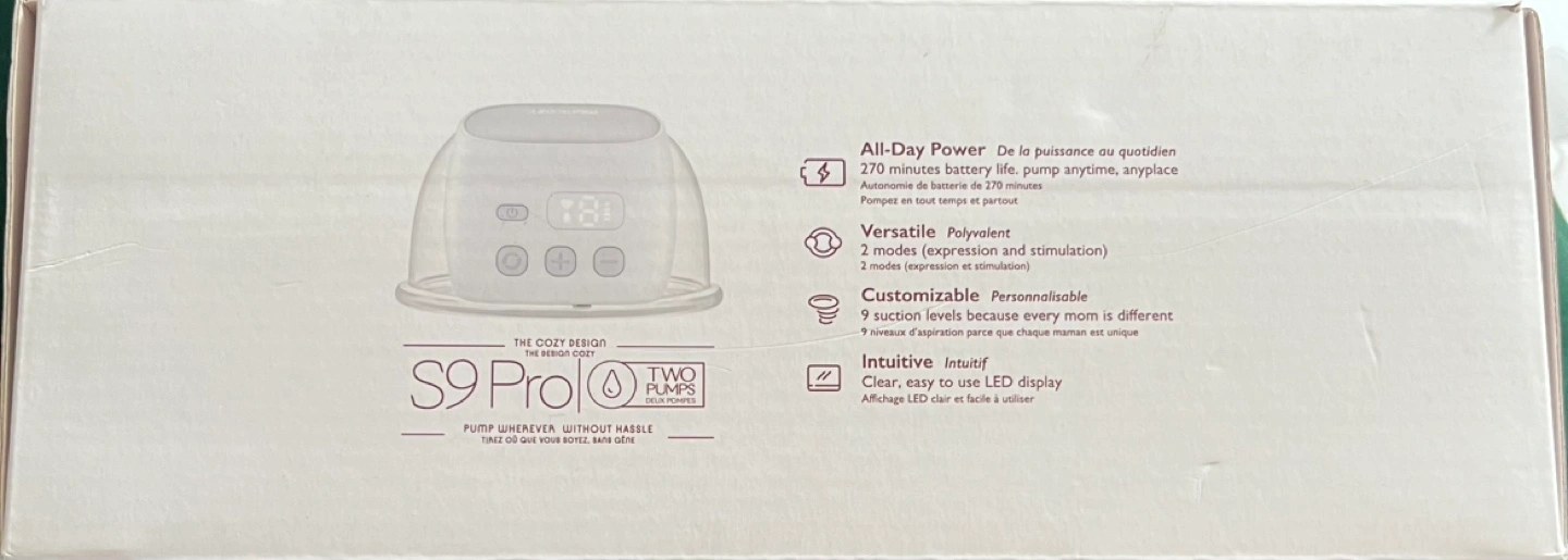 65Double electric breast pump. Portable and wearable design. Includes two pumps. Great for expressing milk on the go. **Introducing the Moncozy Wearable Breast Pump S9 Pro β Comfort & Convenience Redefined!** π€±β¨ Say goodbye to bulky pumps and hello to **hands-free, portable comfort** with the **S9 Pro**. Designed for busy moms, this wearable breast pump lets you pump anytime, anywhere β discreetly and effortlessly. π **Key Features:** β **All-Day Power**: 270 minutes of battery life for uninterrupted use. β **Versatile Performance**: 2 modes (Expression & Stimulation) with 9 customizable suction levels. β **Intuitive Design**: Easy-to-use LED display for hassle-free operation. β **Complete Kit**: Includes 2 pumps, multiple flange sizes (17mm, 19mm, 21mm), storage bags, and more! π° **Original Price: $249 CAD** Selling:$120 π¦ **Whatβs Included:** - 2 Pump Motors | 2 Flanges | 2 Bottles | USB-C Cables | Storage Bags | Quick Start Guide & More!