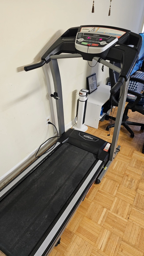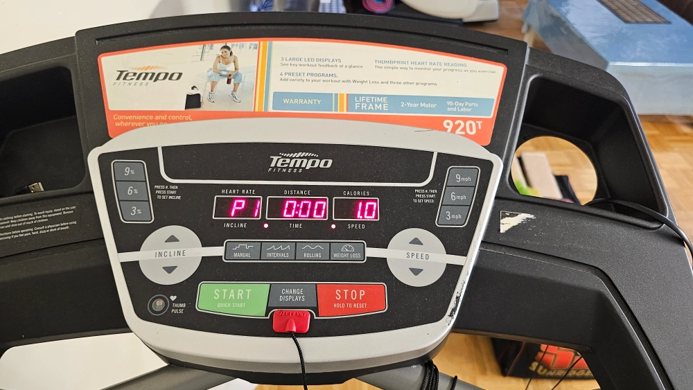 Tempo Fitness treadmill model 920T. Features 3 large LED displays, 4 preset programs, thumbprint heart rate reading, and incline and speed controls.