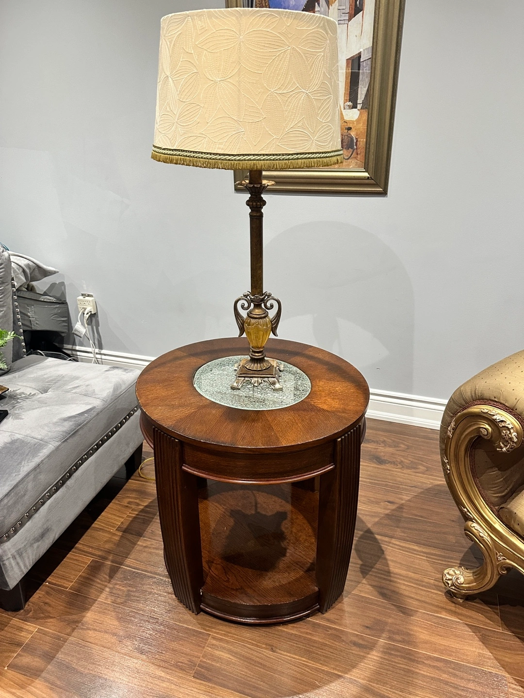 Buy & SellElegant Table Lamp with Round End TableElegant Table Lamp with Round End Table$60Beautiful table lamp, bronze coloured base with glass accents. Features an off white lampshade with leaf pattern.ConditionLike newWHERE TO MEETCheck LocationView MapSELLERverifiedhaleyWoodbridge W964 reviews0 chats·0 favorites·27 views