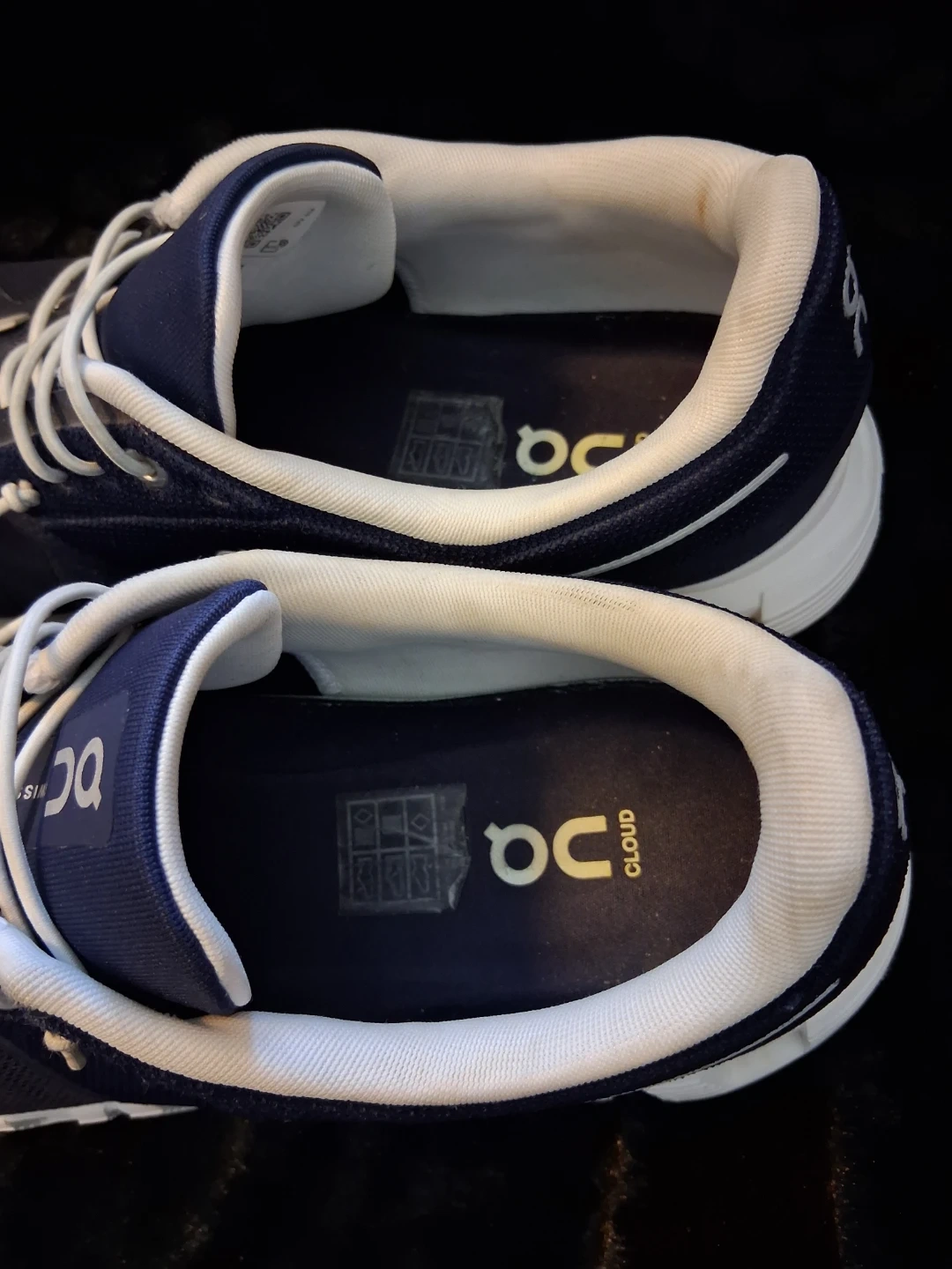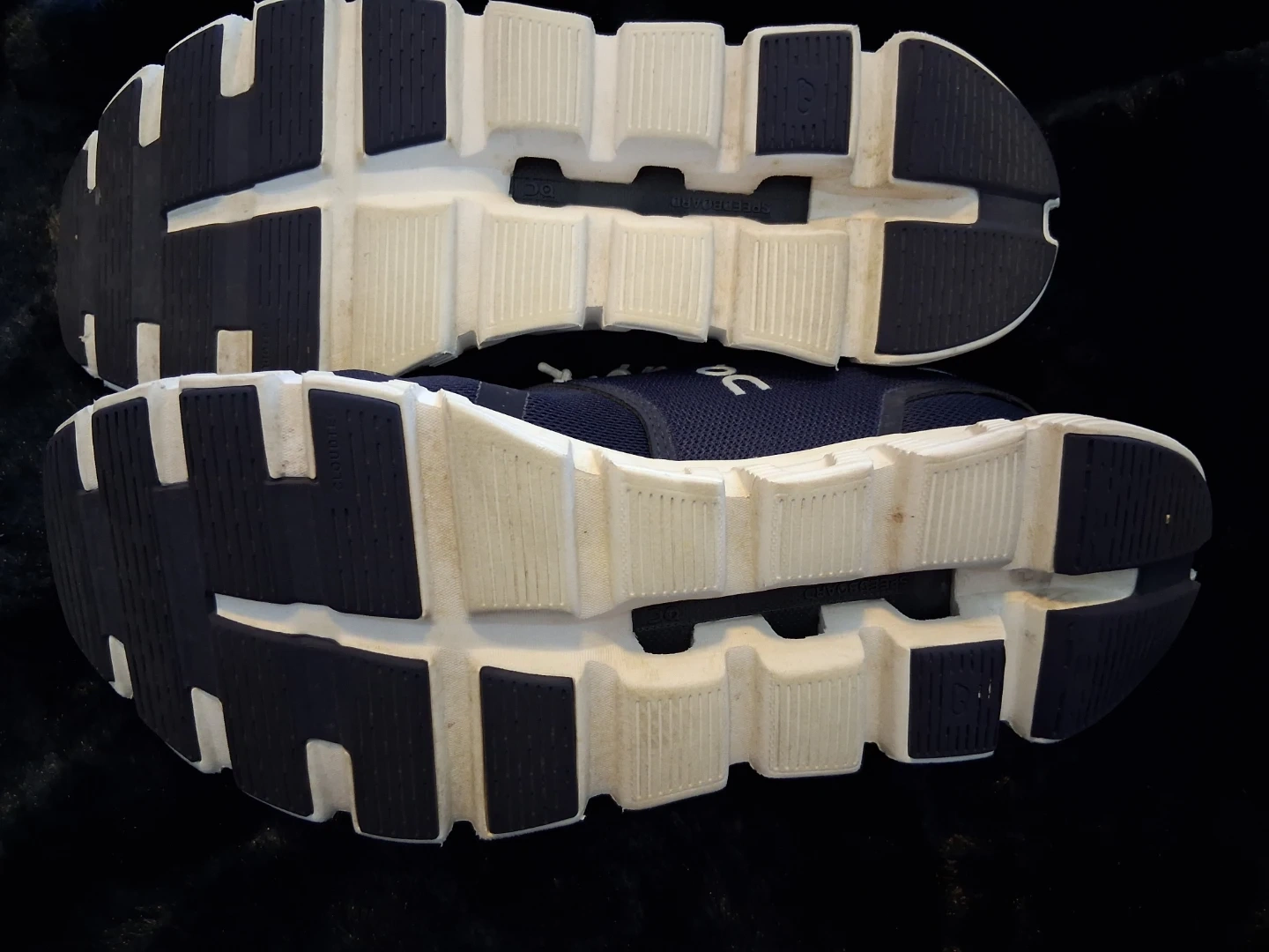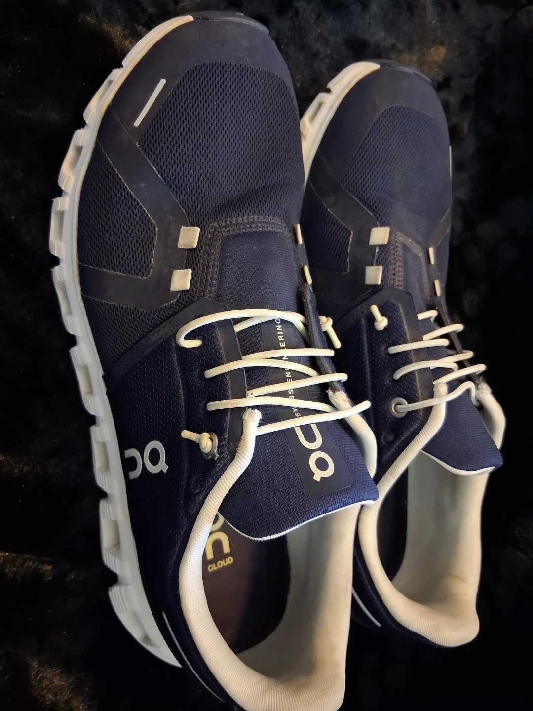 These ON Cloud running shoes are a deep navy blue with white accents. They're lightweight and designed for comfort. The sole has a unique CloudTec® cushioning system. Perfect for daily runs or casual wear!