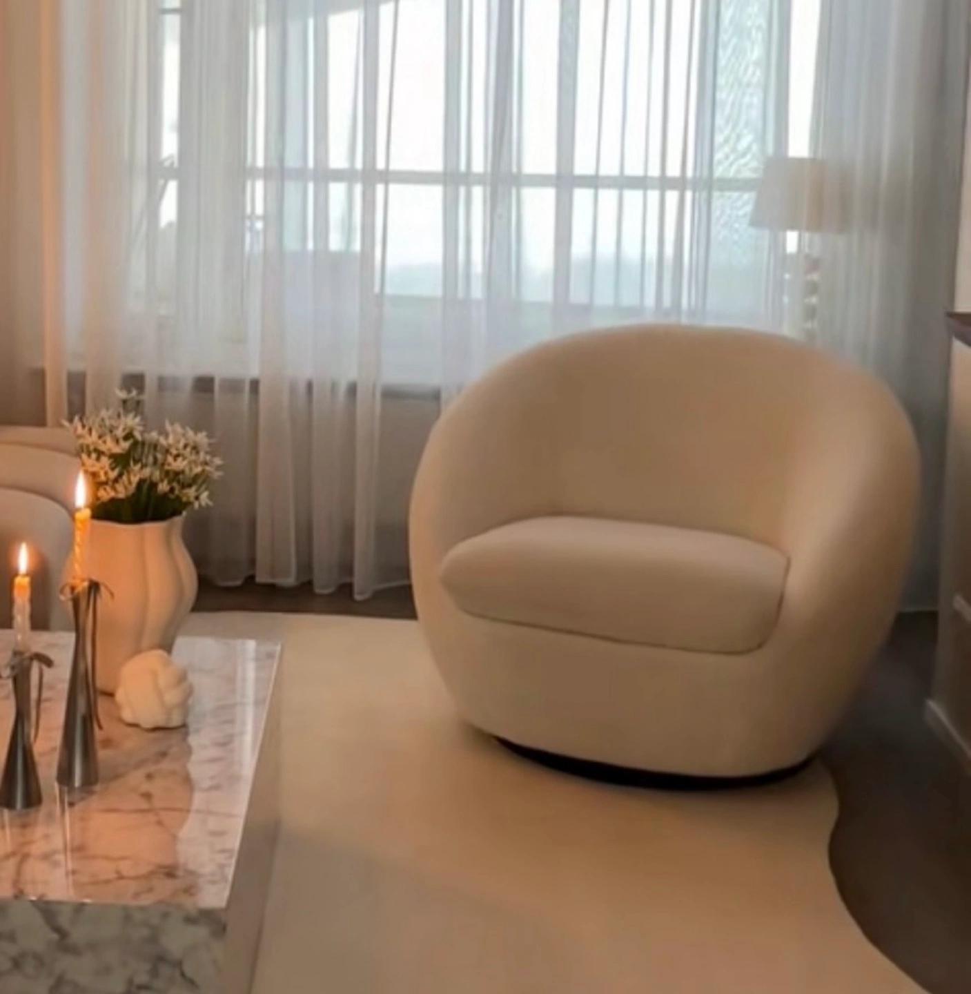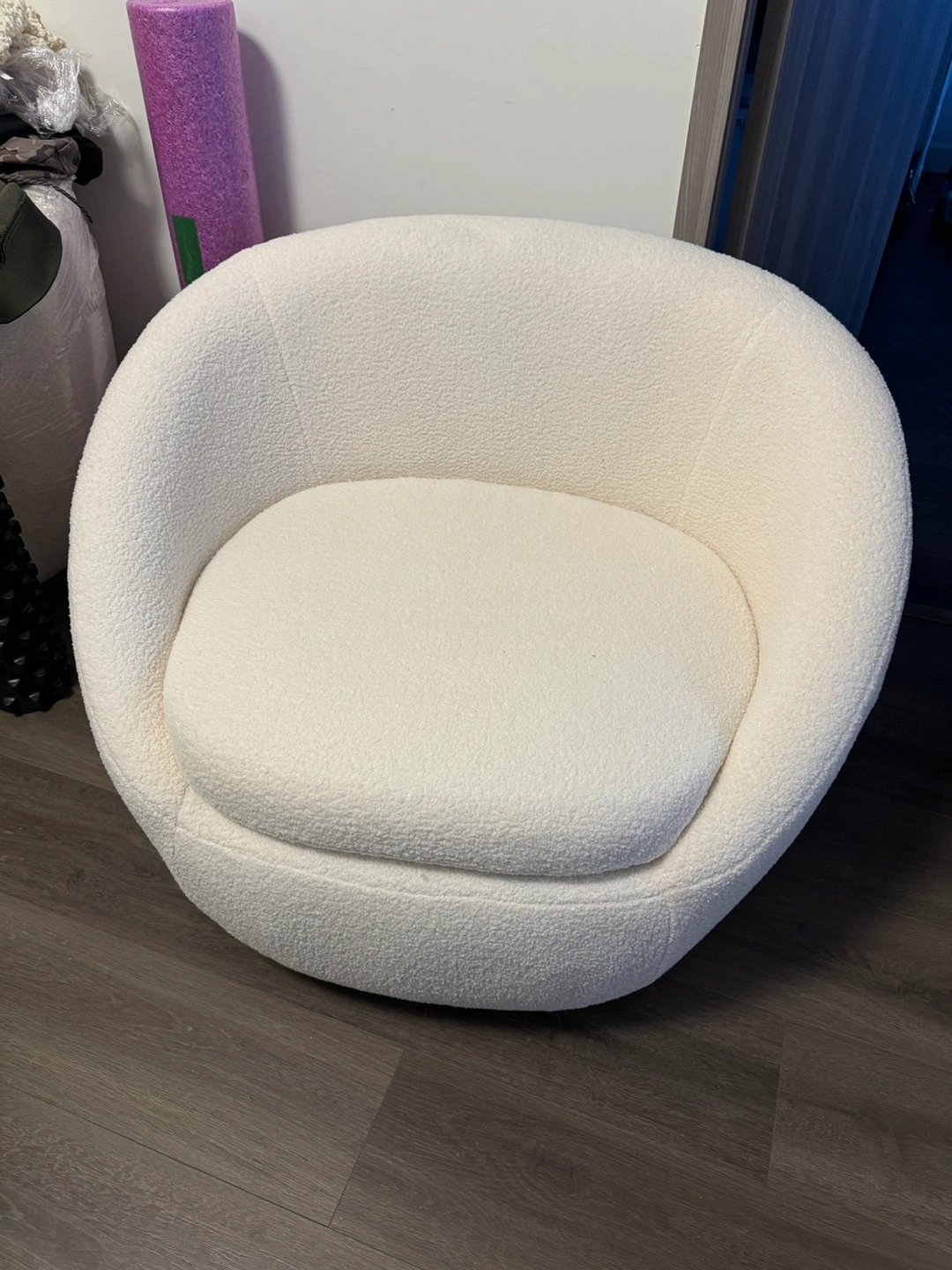 Modern swivel accent chair. Off-white boucle fabric. Excellent condition. Comfortable and stylish. Perfect for living room or bedroom. Free shipping.