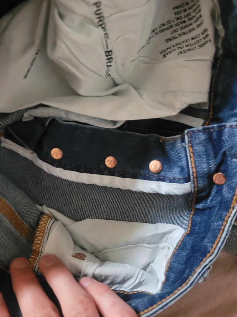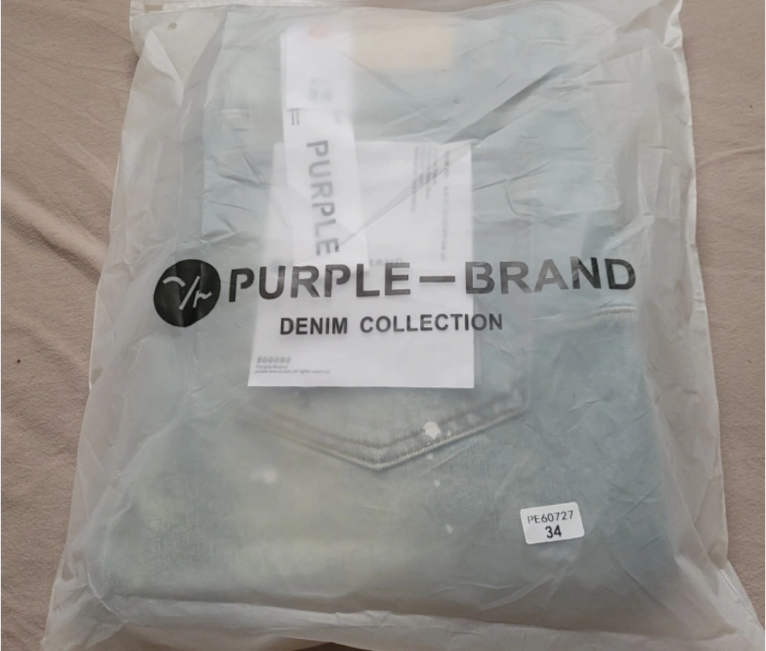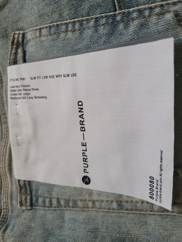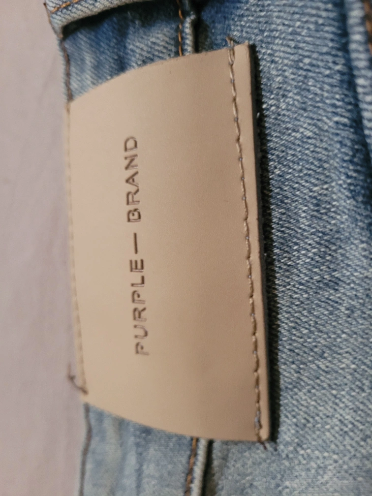 Authentic Men's size 34 Purple Brand jeans purchased of the Purple website for $315 plus tax. Slim fit low rise with slim leg. Lined back pockets, back pocket rivets, copper belt loops, reinforced belt loop back tacking. Light wash with paint splatters and distressing.