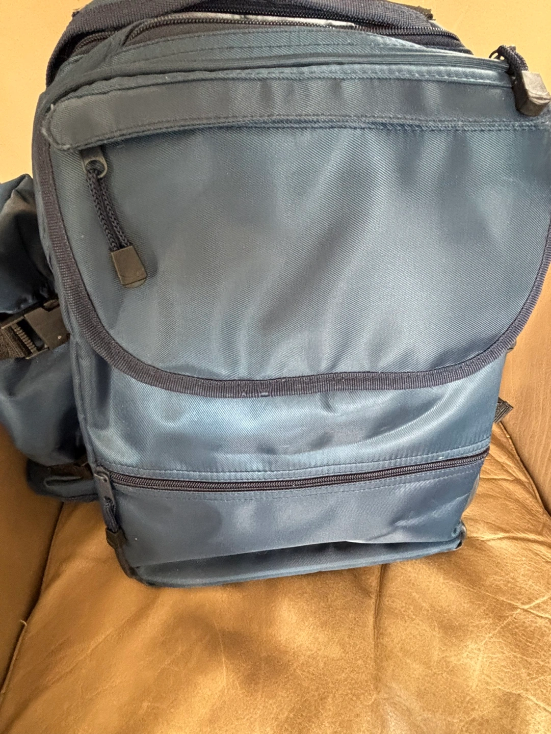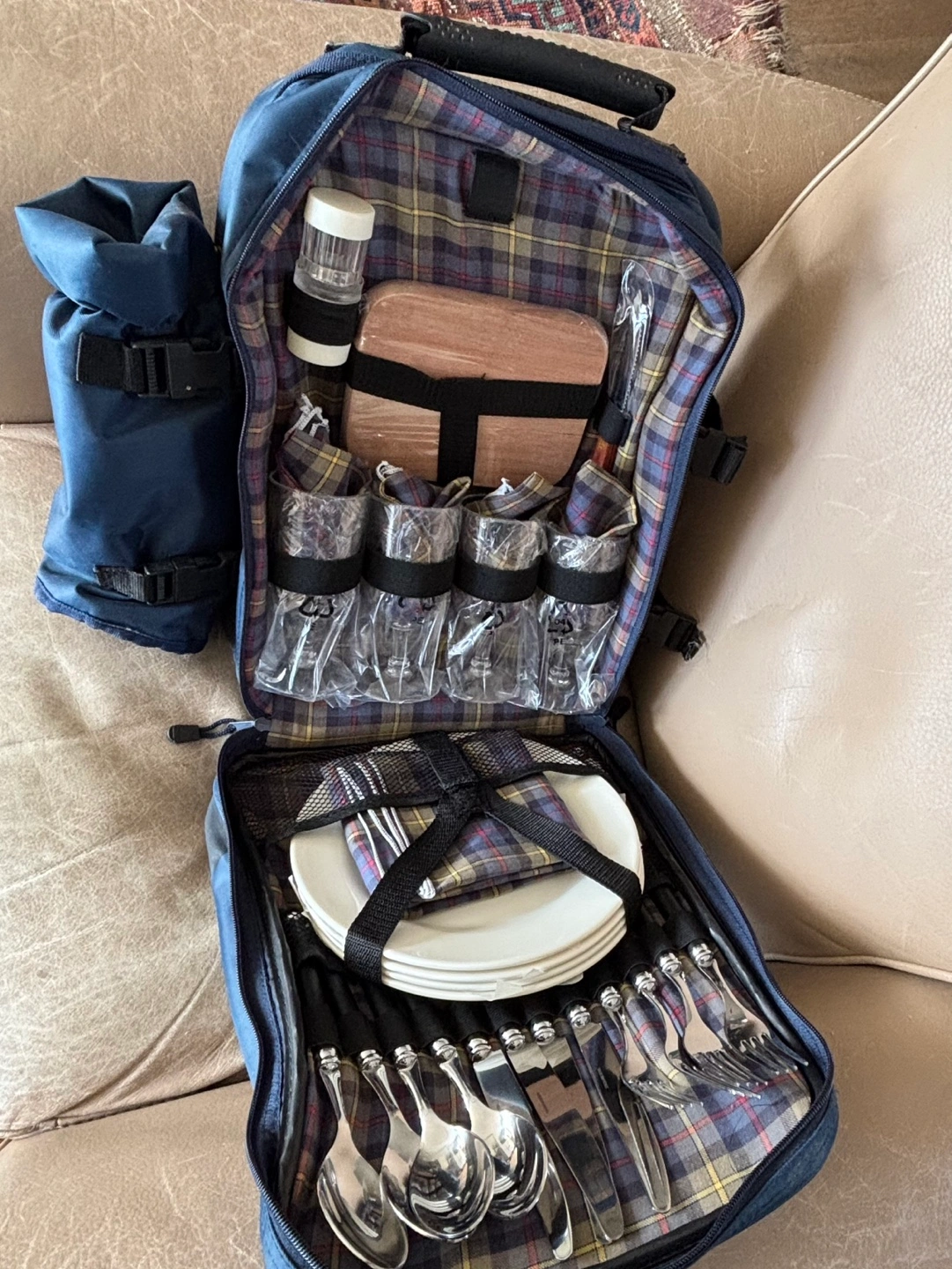 Blue picnic backpack with 4 placesettings And Wine cooler holder attached