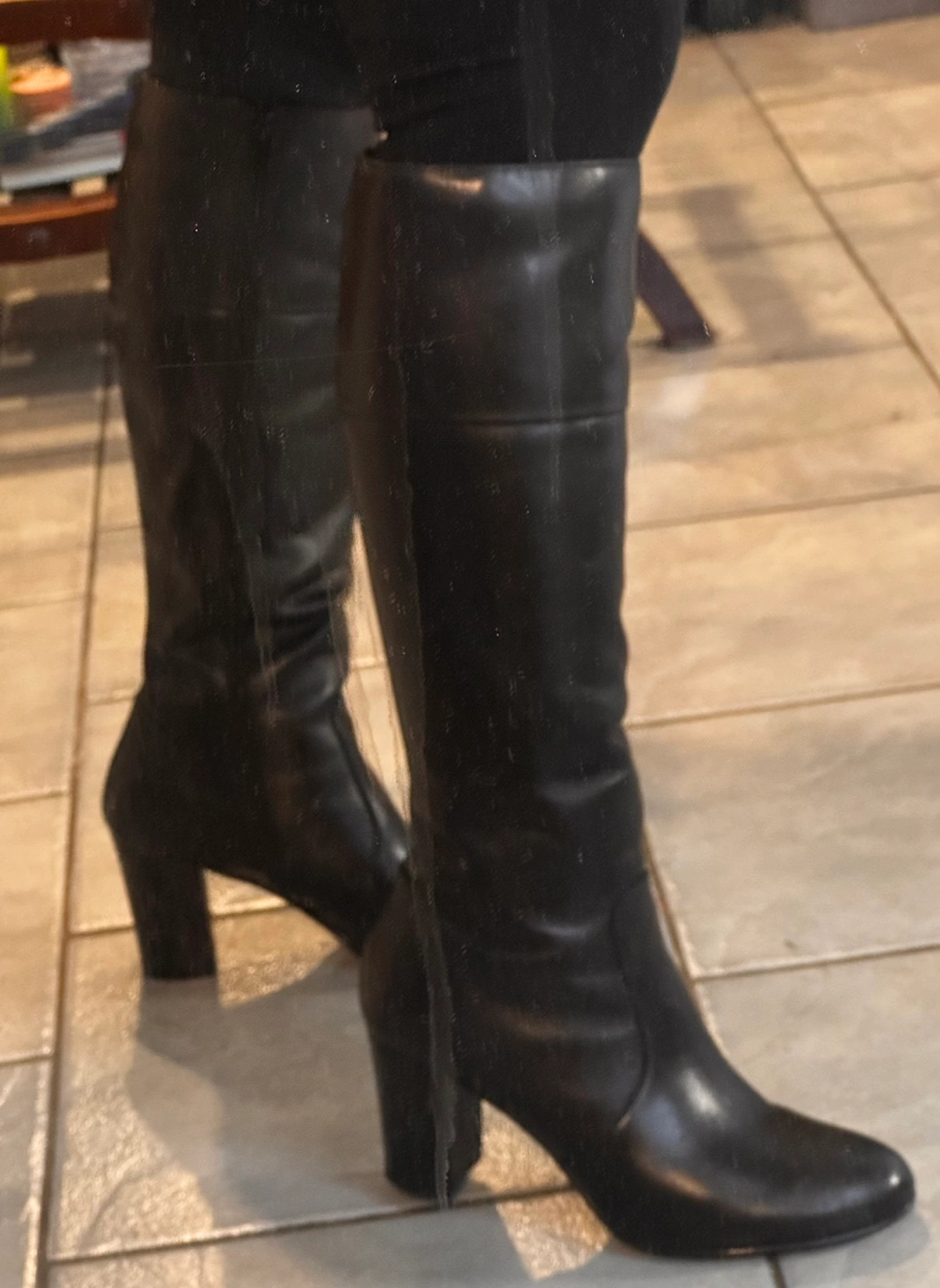 171Elegant black leather knee-high boots. Block heel. Back zipper closure. Stylish and comfortable. Lightly worn. Needs a new home. Asking $75 OBO