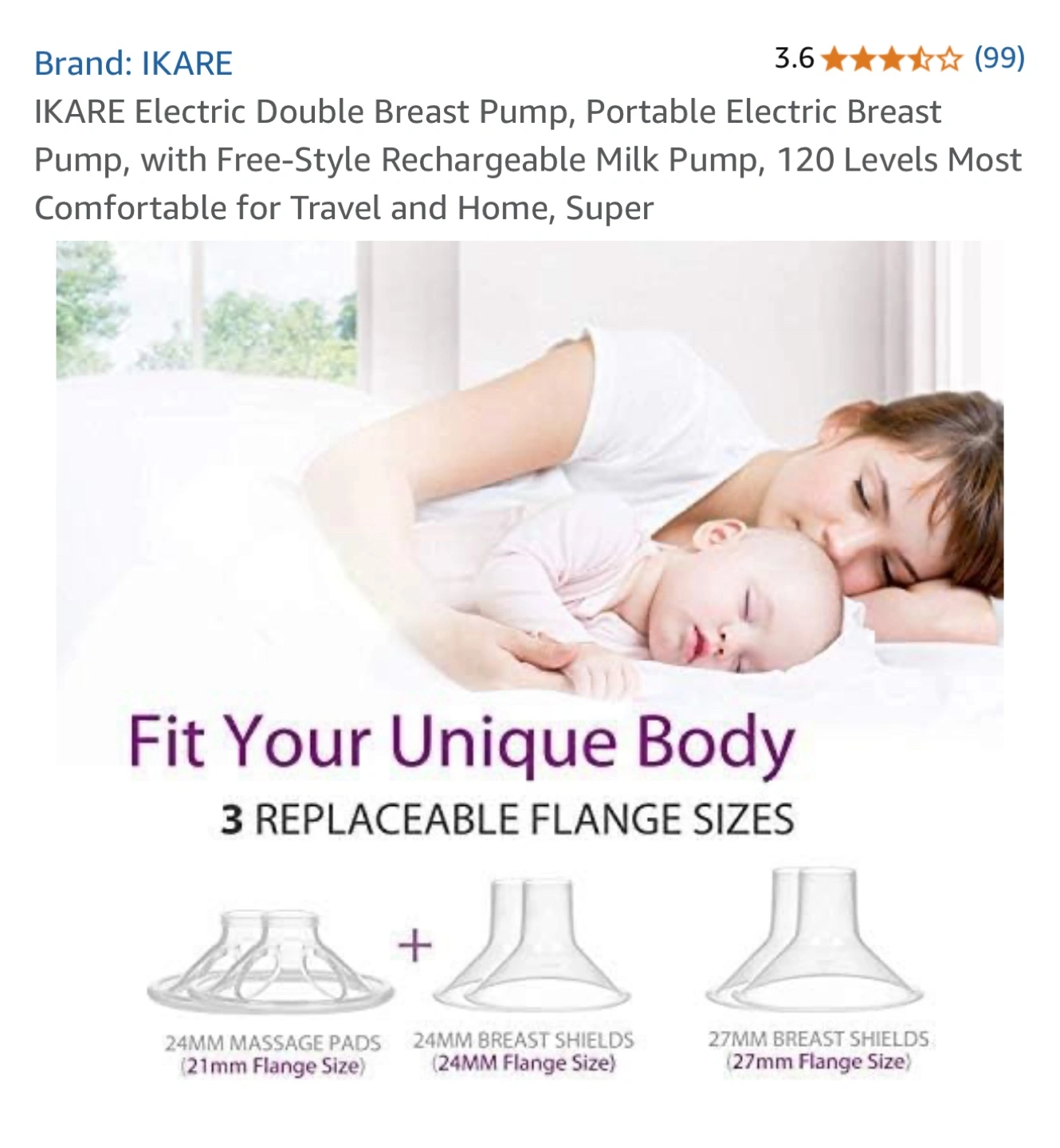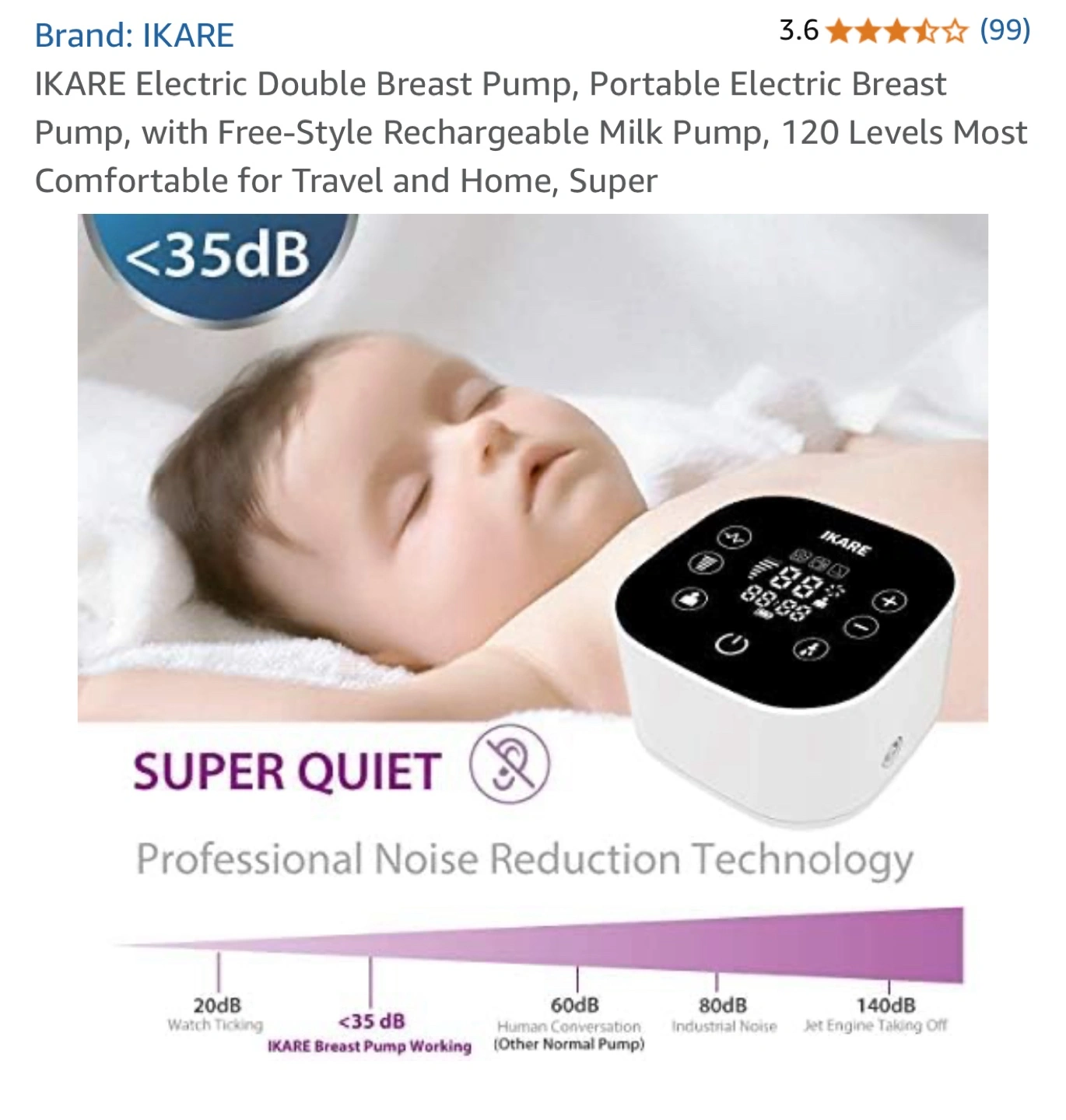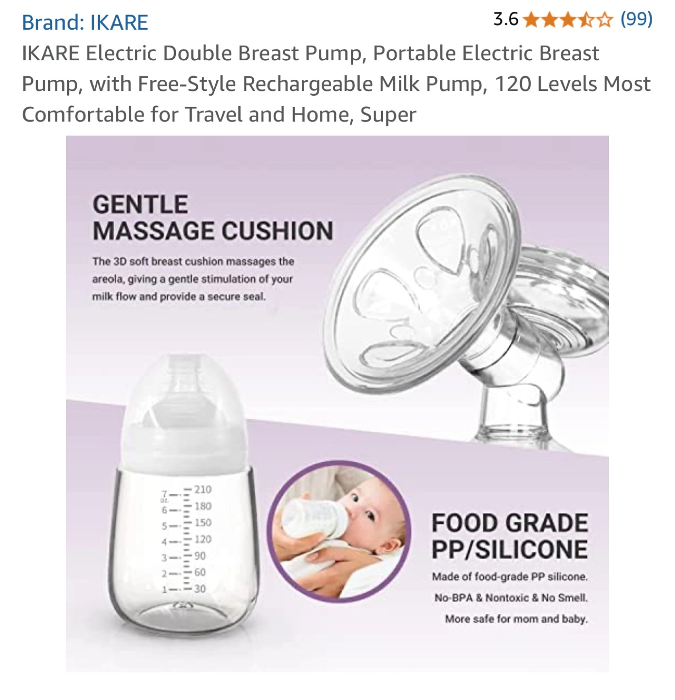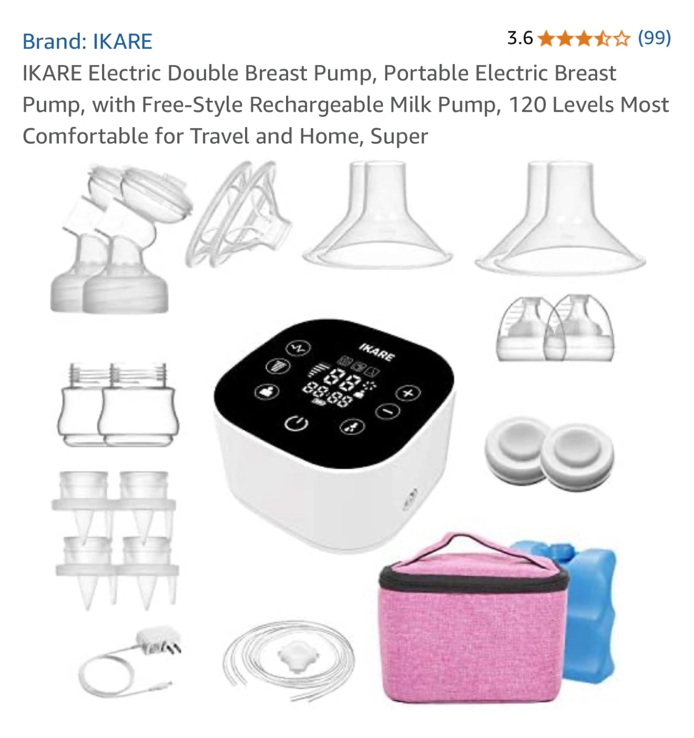 Double electric breast pump. Portable and rechargeable. Includes carrying case and bottles. 120 suction levels. Food-grade silicone parts. Quiet operation.
