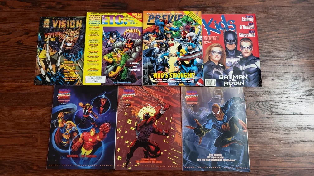 Variety of comic books and magazines. Includes titles featuring Wolverine, Batman & Robin, and various Marvel characters. Great for collectors.