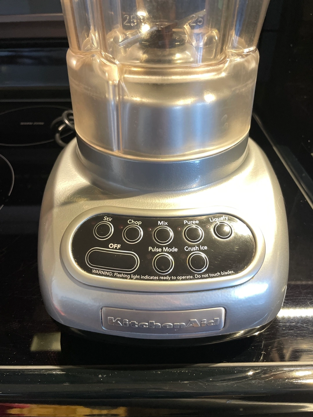 Silver and clear personal-size blender. Multiple speed settings, including pulse and crush ice. Features a clear plastic pitcher. Good for smoothies and small batches.