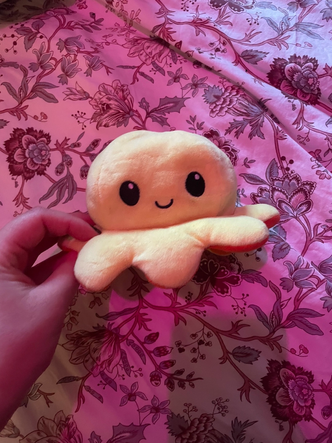 Adorable reversible plush octopus. Features two expressions: happy and angry. Yellow and orange plush. Soft and cuddly. Perfect for collectors or as a gift.