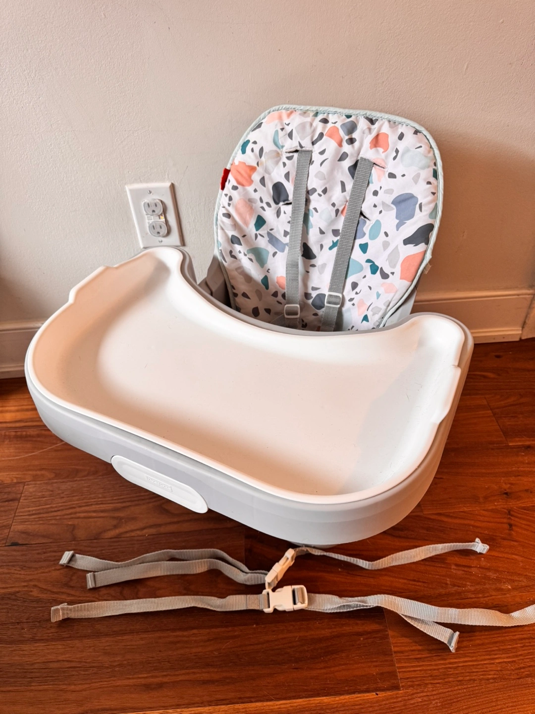 Grey plastic high chair. Removable tray. Features a colourful patterned seat cushion. Includes safety straps. Suitable for babies and toddlers.