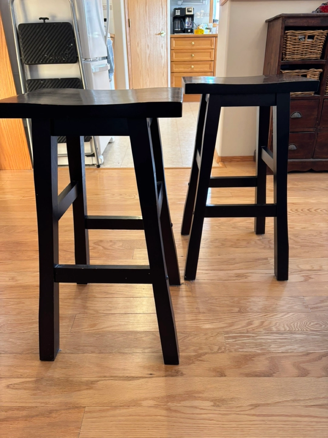 Set of simple black wooden bar stools. Solid wood construction. Sleek and minimalist design. Perfect for a kitchen island or bar. 26 inches tall, 15 inches wide