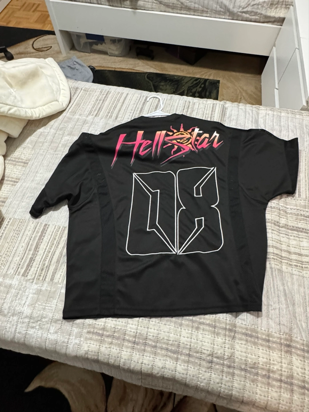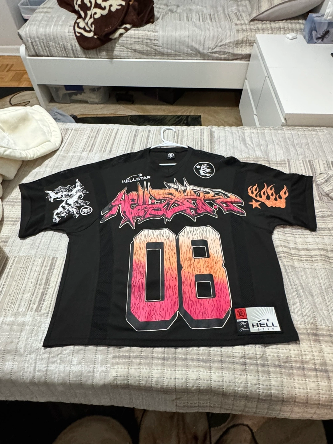 67Black jersey. Large size. Features Hellstar branding and number 08. Mesh detailing on the sides. Unique graphic design.