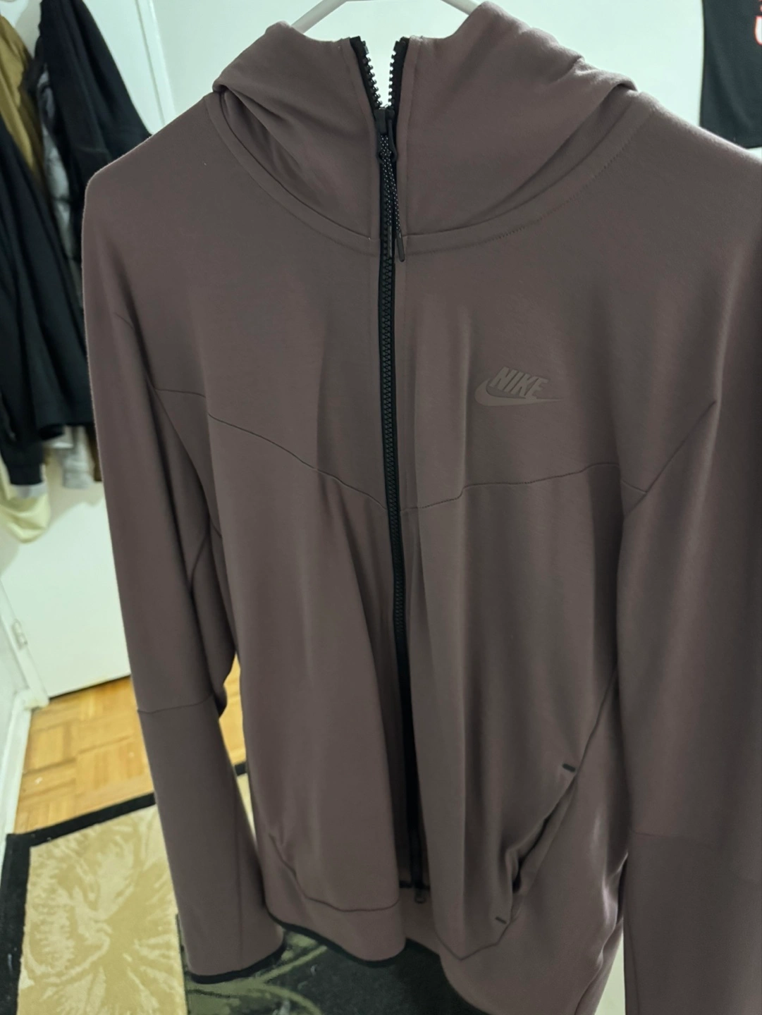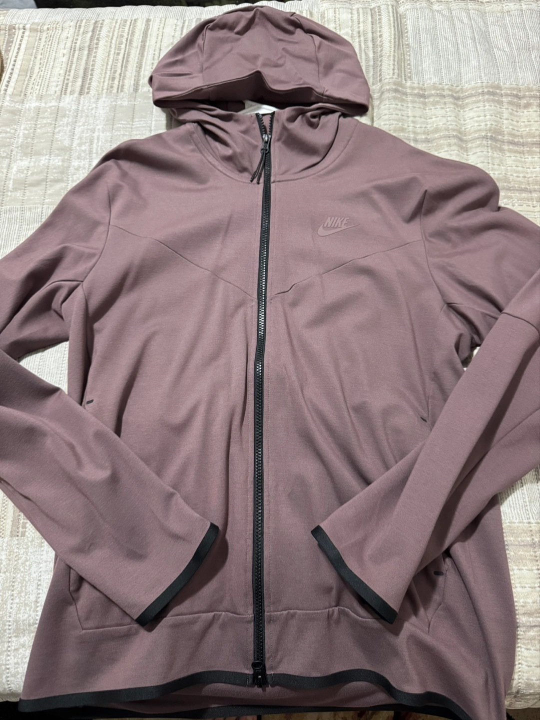 67Men's Nike Tech Fleece zip-up hoodie. Mauve colour. Full zip closure. Attached hood. Long sleeves. Soft and comfortable fabric. Great for layering or wearing on its own.