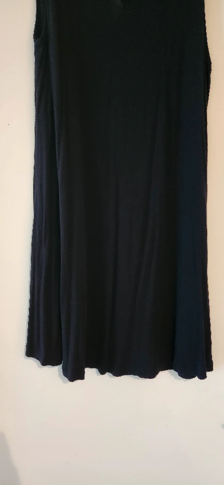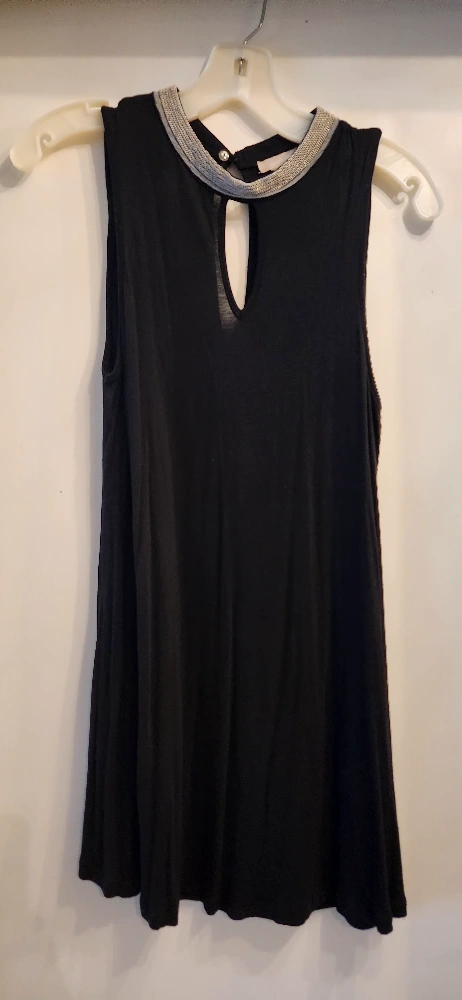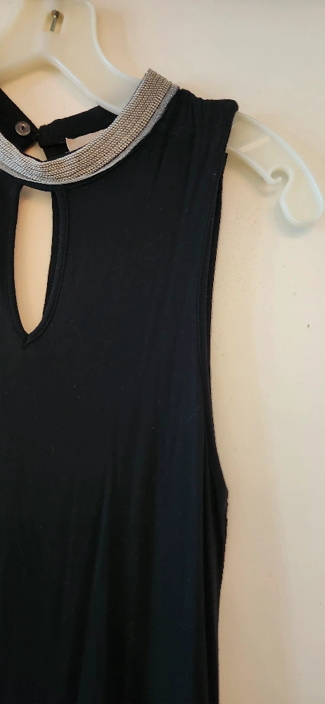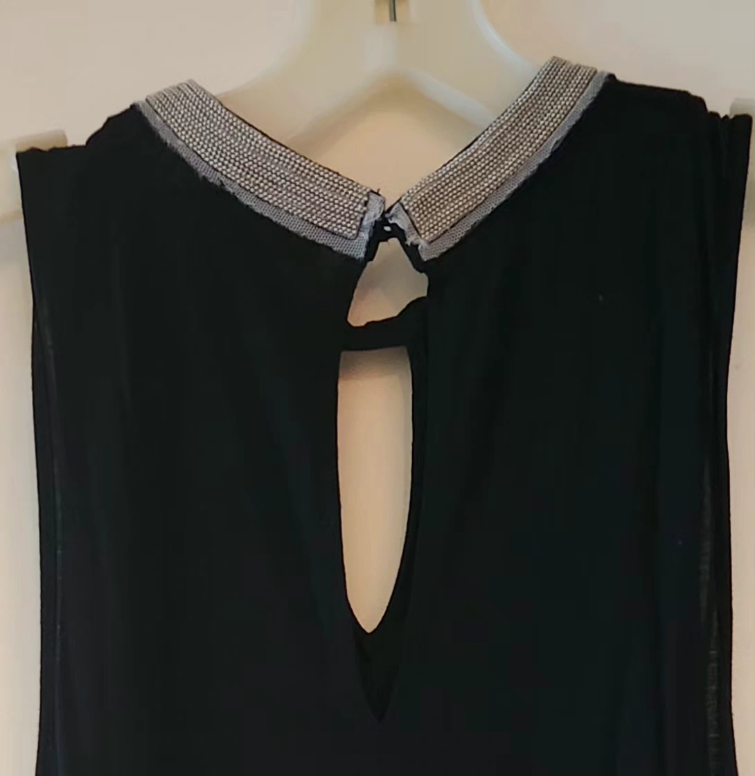 Women's black sleeveless tunic top. Features a keyhole neckline and a thick silver beaded detail around the neck that is secured in place with a small button at the nape. Relaxed fit, A-line silhouette. Made of 100% viscose material. Soft and comfortable. Great for casual or dressed up occasions. Great condition with no rips or stains.