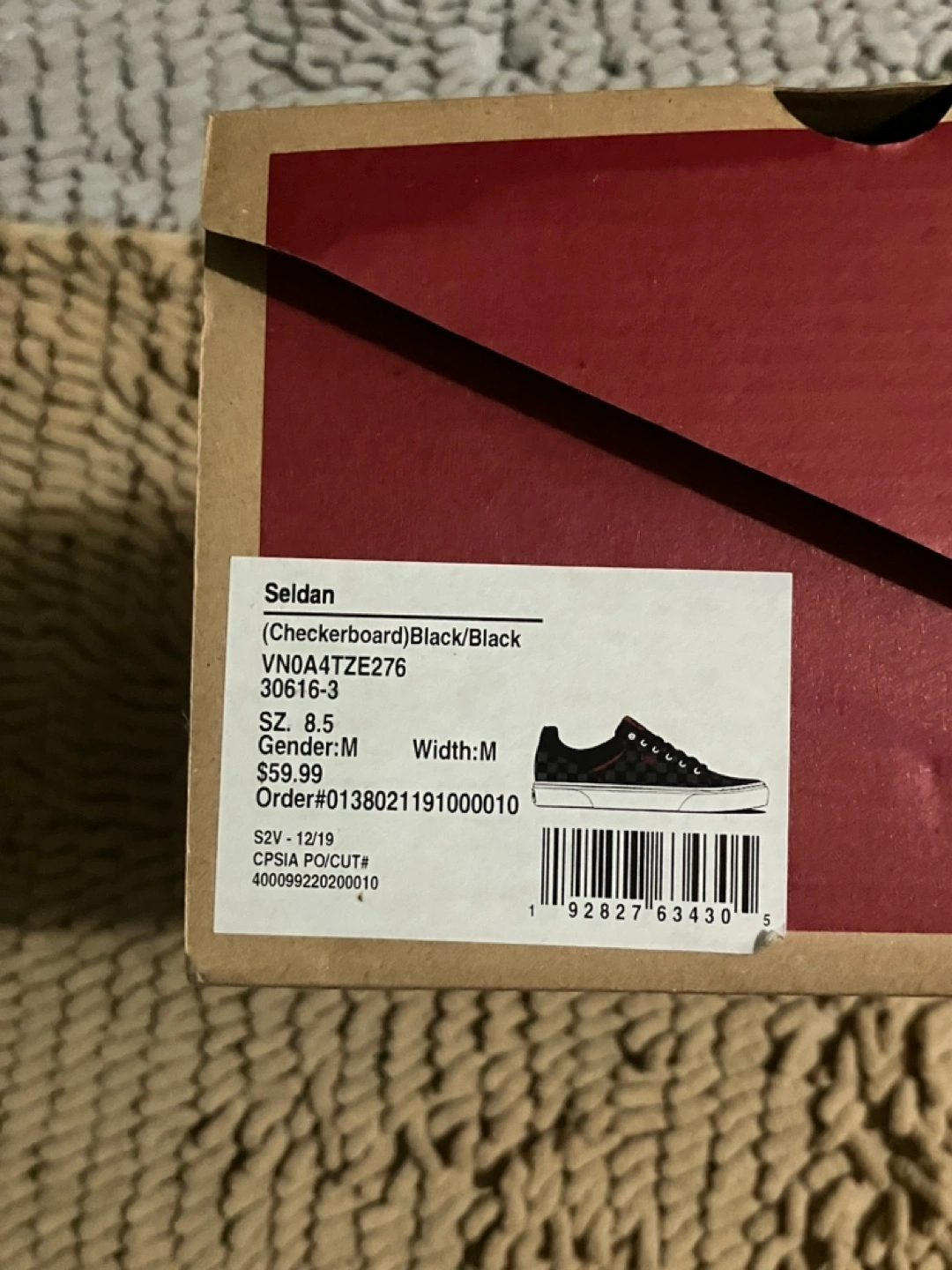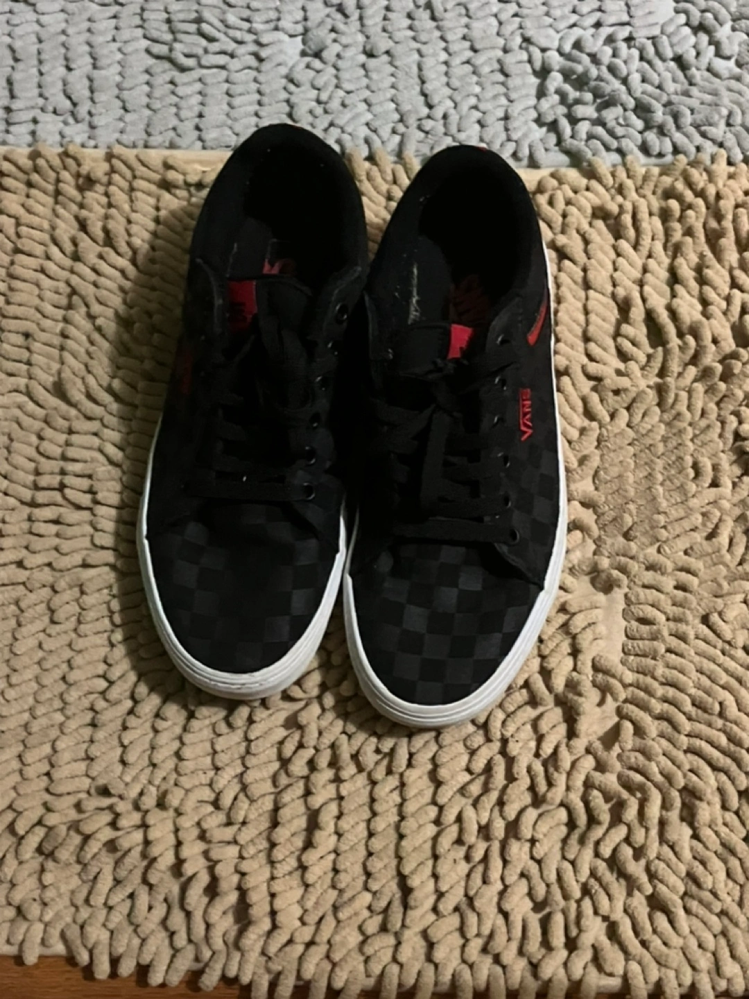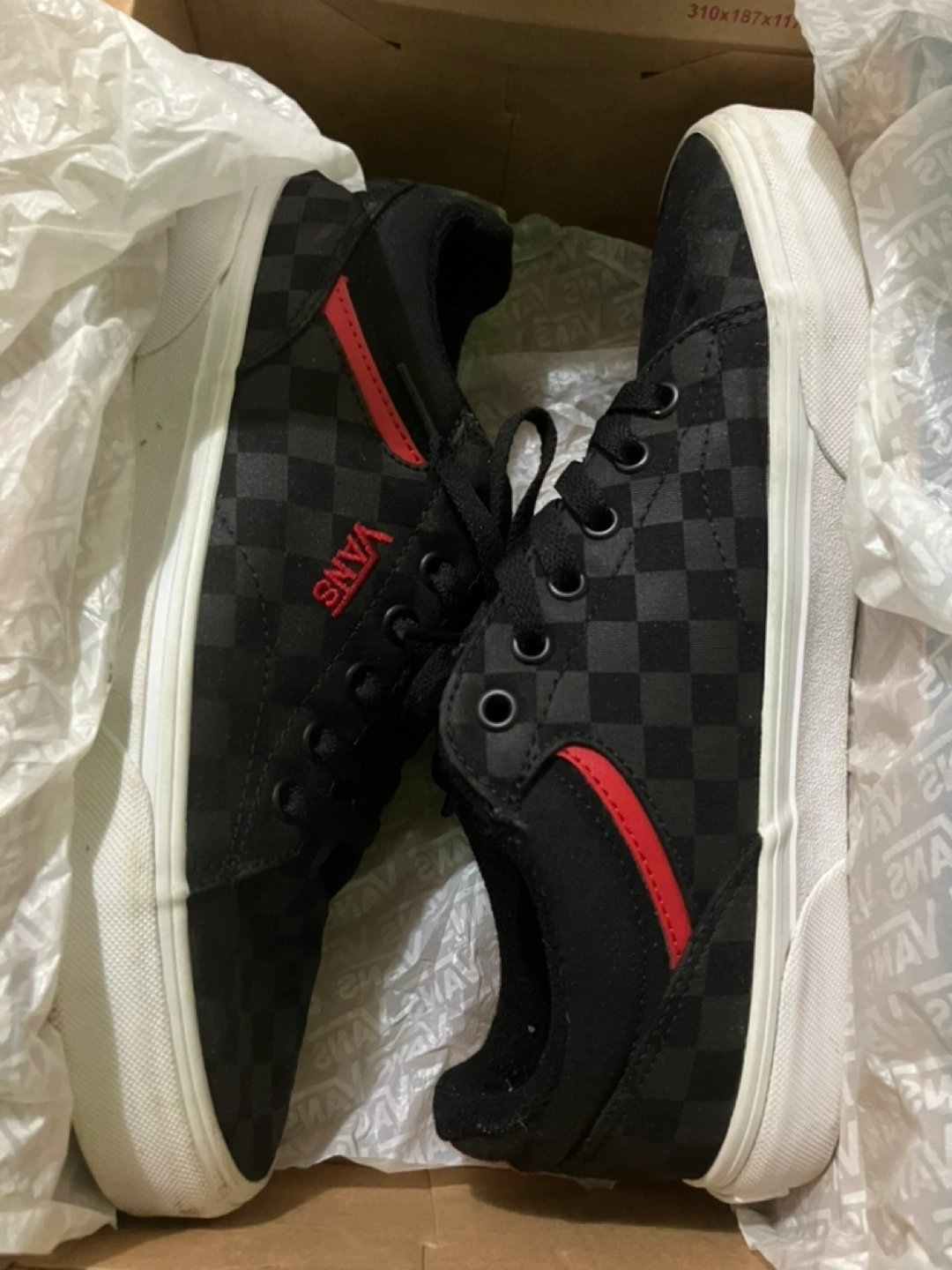 Men's Vans shoes. Size 8.5. Black and red accents. Checkerboard pattern. Used as shown still wearable price is negotiable open to offer and trades
