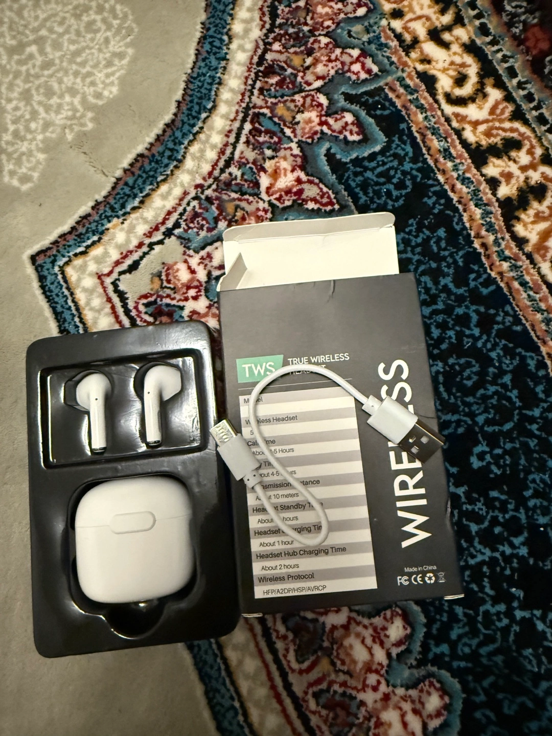 True wireless stereo earbuds. Includes charging case and USB charging cable. Portable and compact design. Great for listening to music or taking calls.
