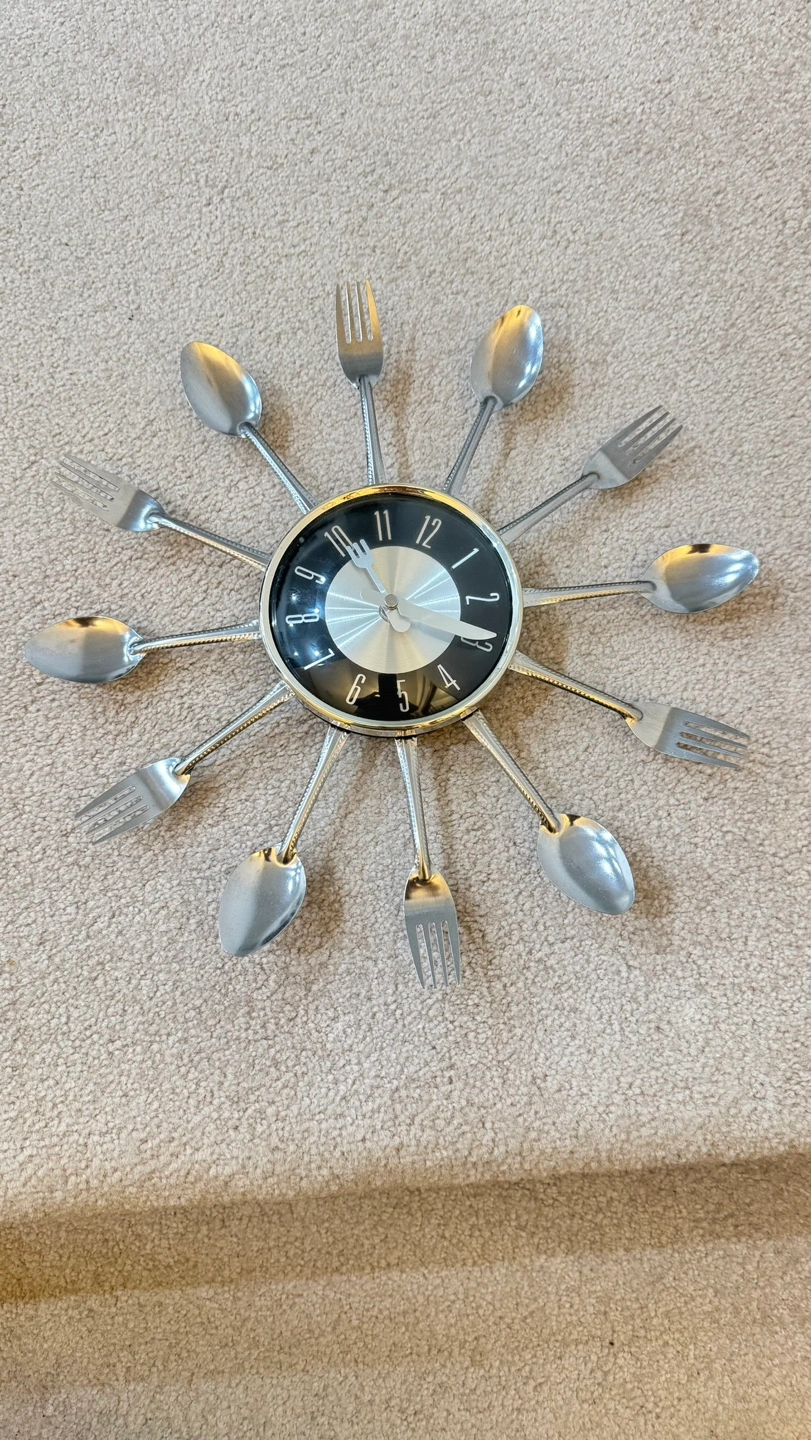 Wall clock featuring spoons and forks. Black face, silver accents. Modern design. Great for kitchen or dining room. Pick up in Heritage Park area, near Grace Hospital.