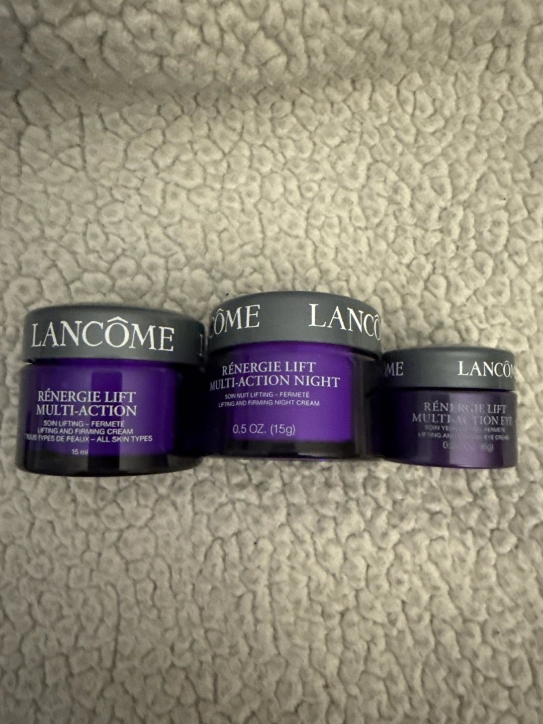 Lancôme Renergie Lift Multi-Action set. Includes day cream 15 ml, night cream 15 ml, and eye cream 6 gm. For all skin types.