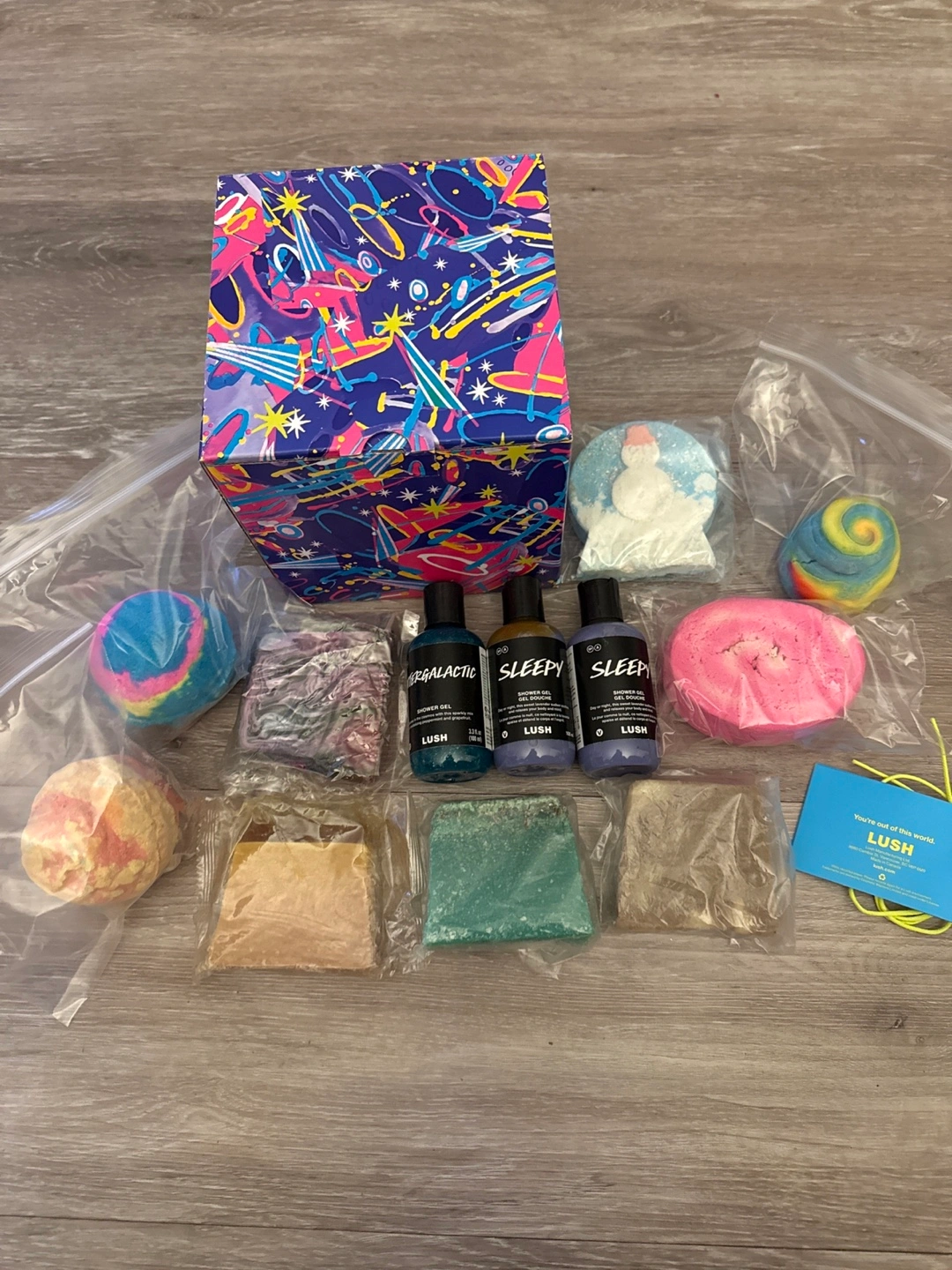 350Lush gift set. Includes 5 bath bombs, 3 shower gels, and 5 soaps. New, unopened. Colorful and fun. 13 products plus gift box. Cash only.