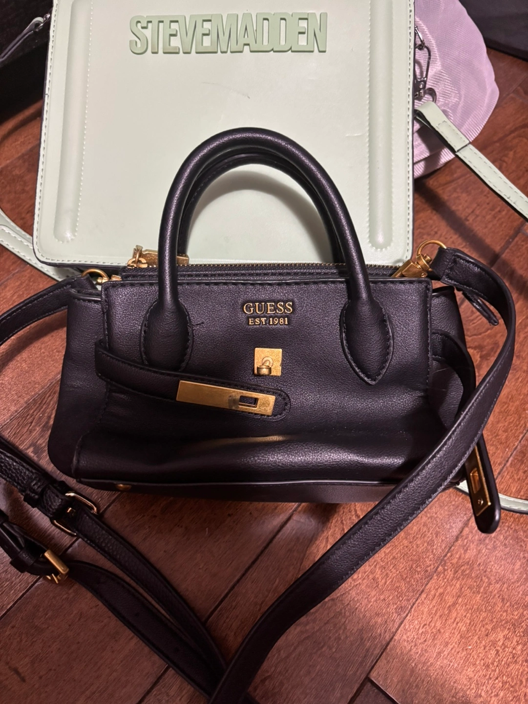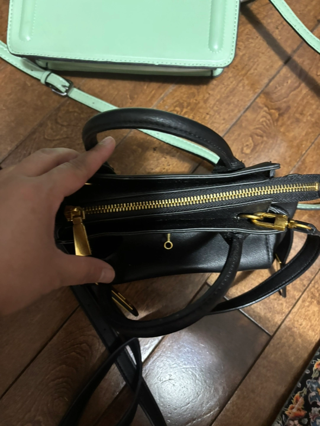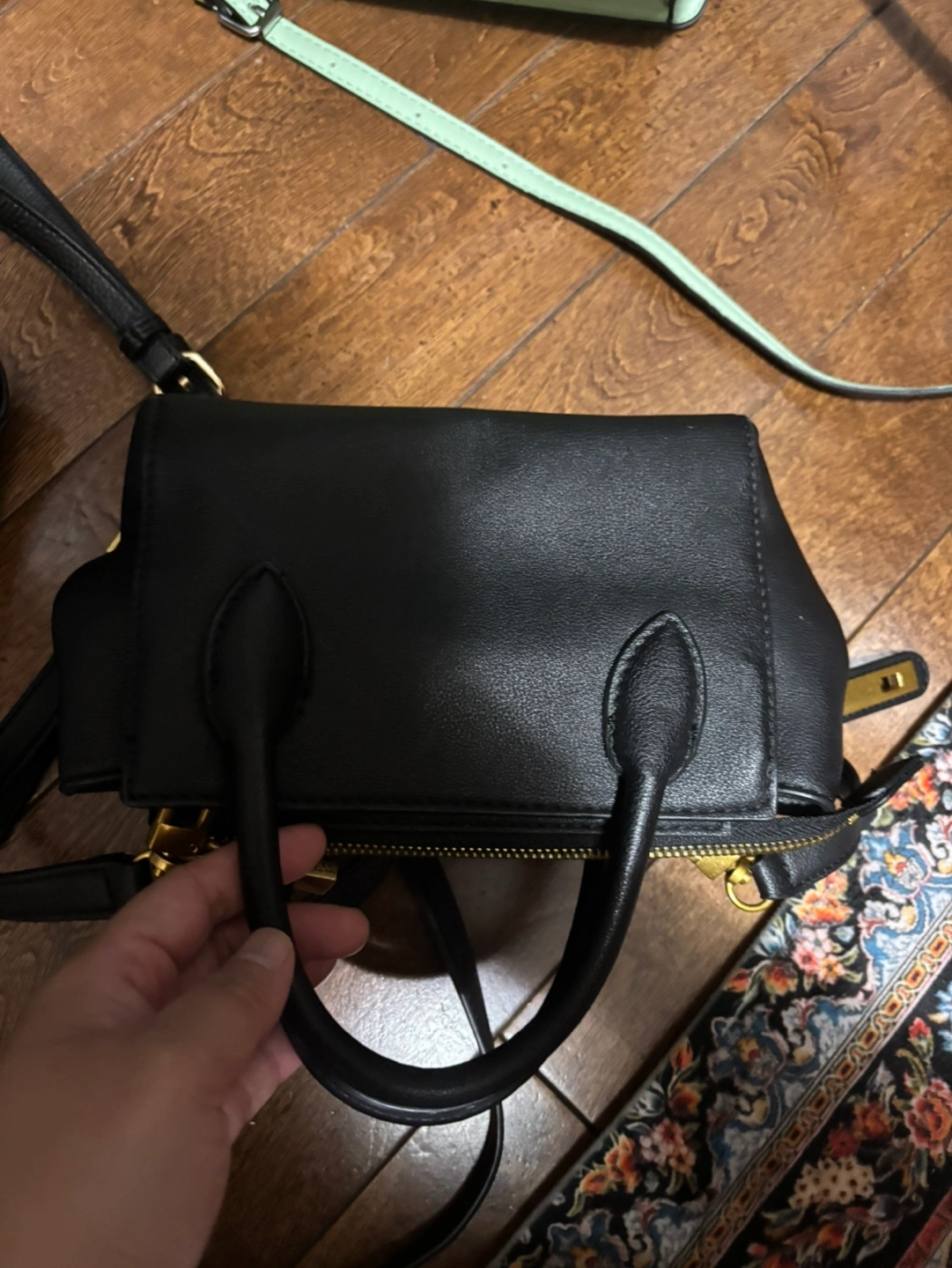 39Small black handbag. Gold-tone hardware. Zip closure. Removable shoulder strap. Excellent for everyday use.