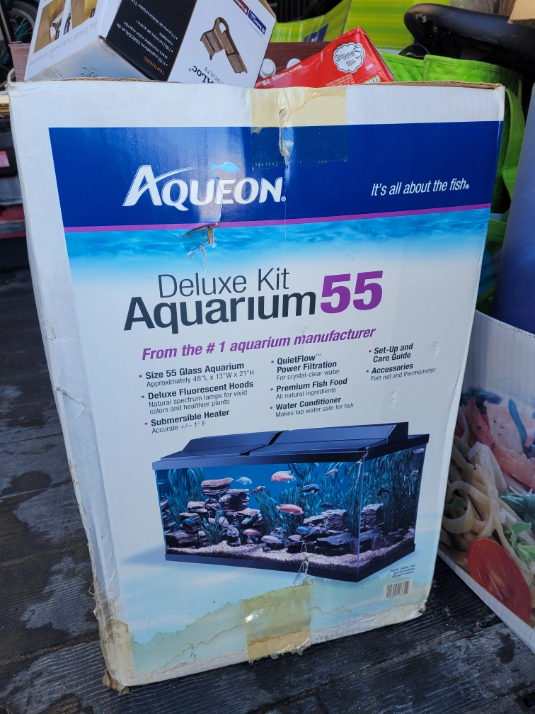 55-gallon aquarium kit. Includes fluorescent hood, submersible heater, filter, fish food, water conditioner, and accessories. Approximately 48"L x 13"W x 21"H.