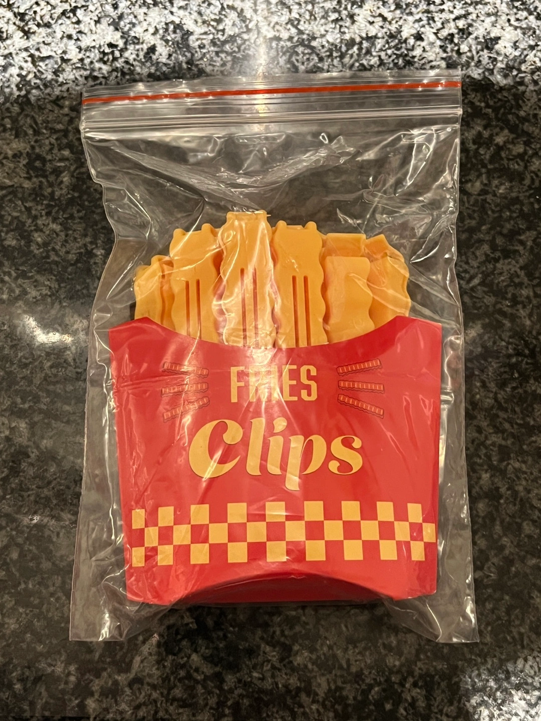 Sealed and never used. Fry-shaped sealing clips. The box is magnetic to attach to the fridge, while the clips allow you to pack and seal your snacks without the need for plastic bags or containers.