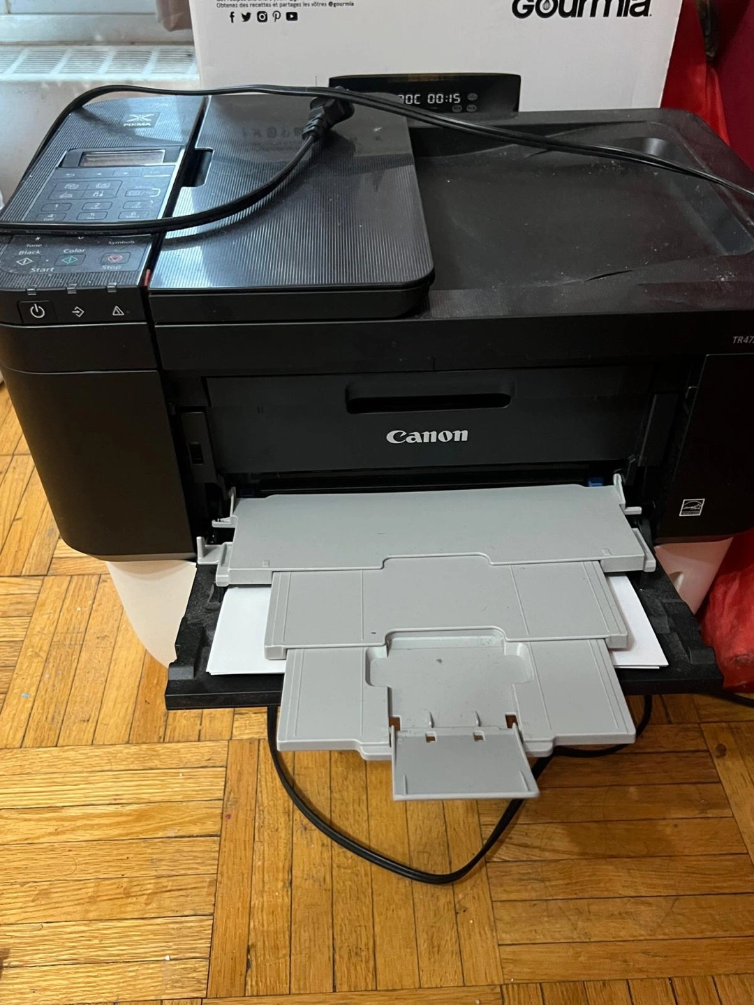 18Used Canon Pixma TR4720 printer. All-in-one functions. Wireless connectivity. Includes power cord. Shows some wear from use.