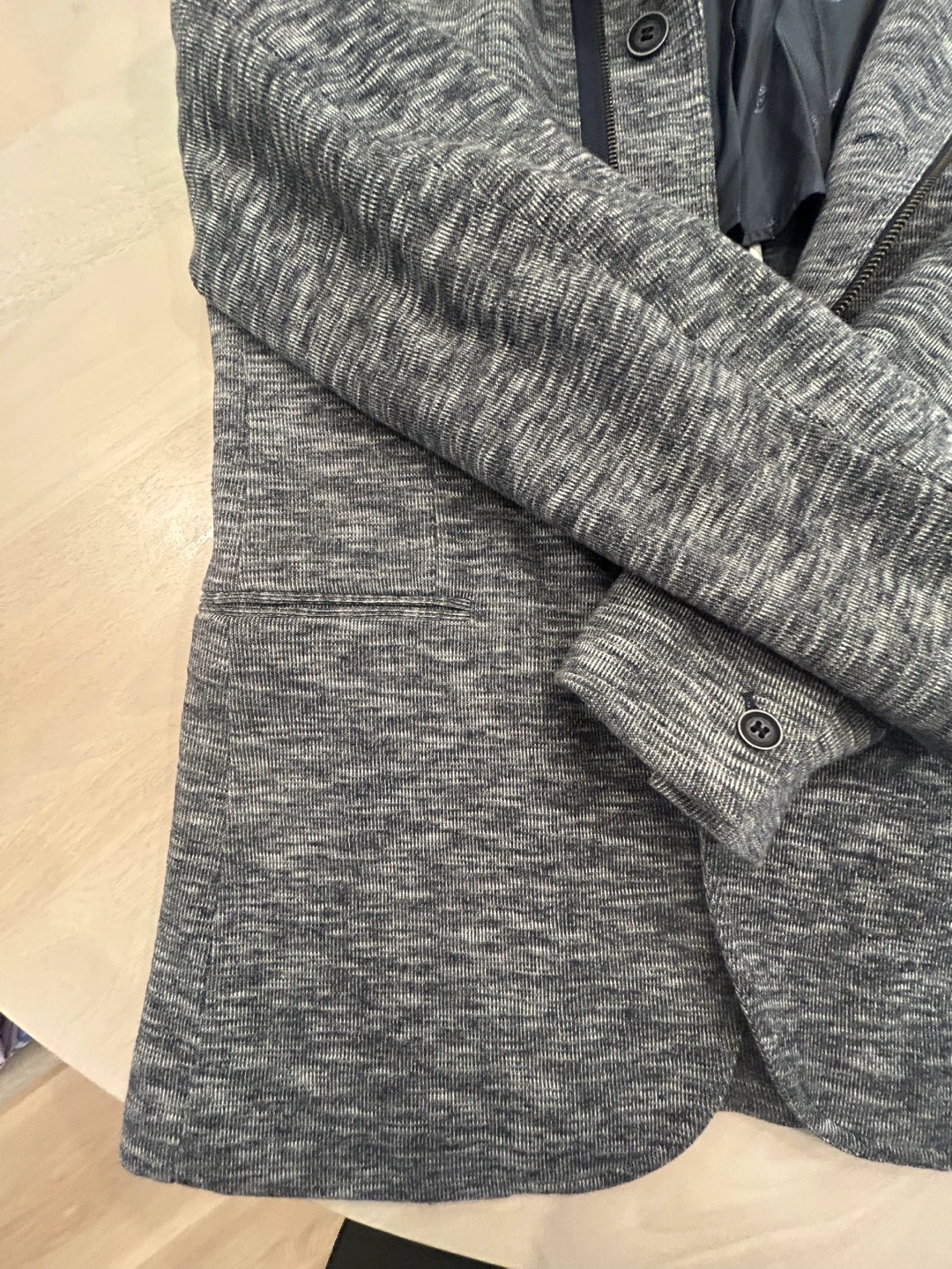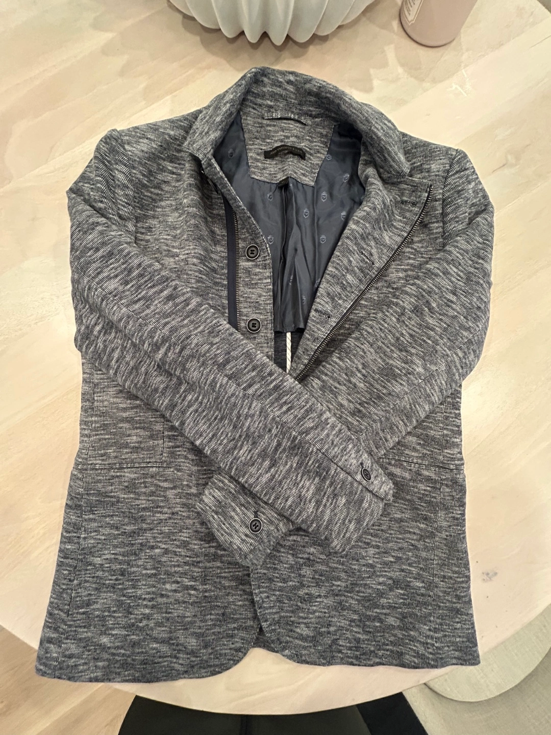 Men's size 40 John Varvatos U.S.A. knit blazer. Features a zip and button closure. Grey and black heathered knit fabric. Long sleeves with button cuffs. Two pockets. Excellent condition.