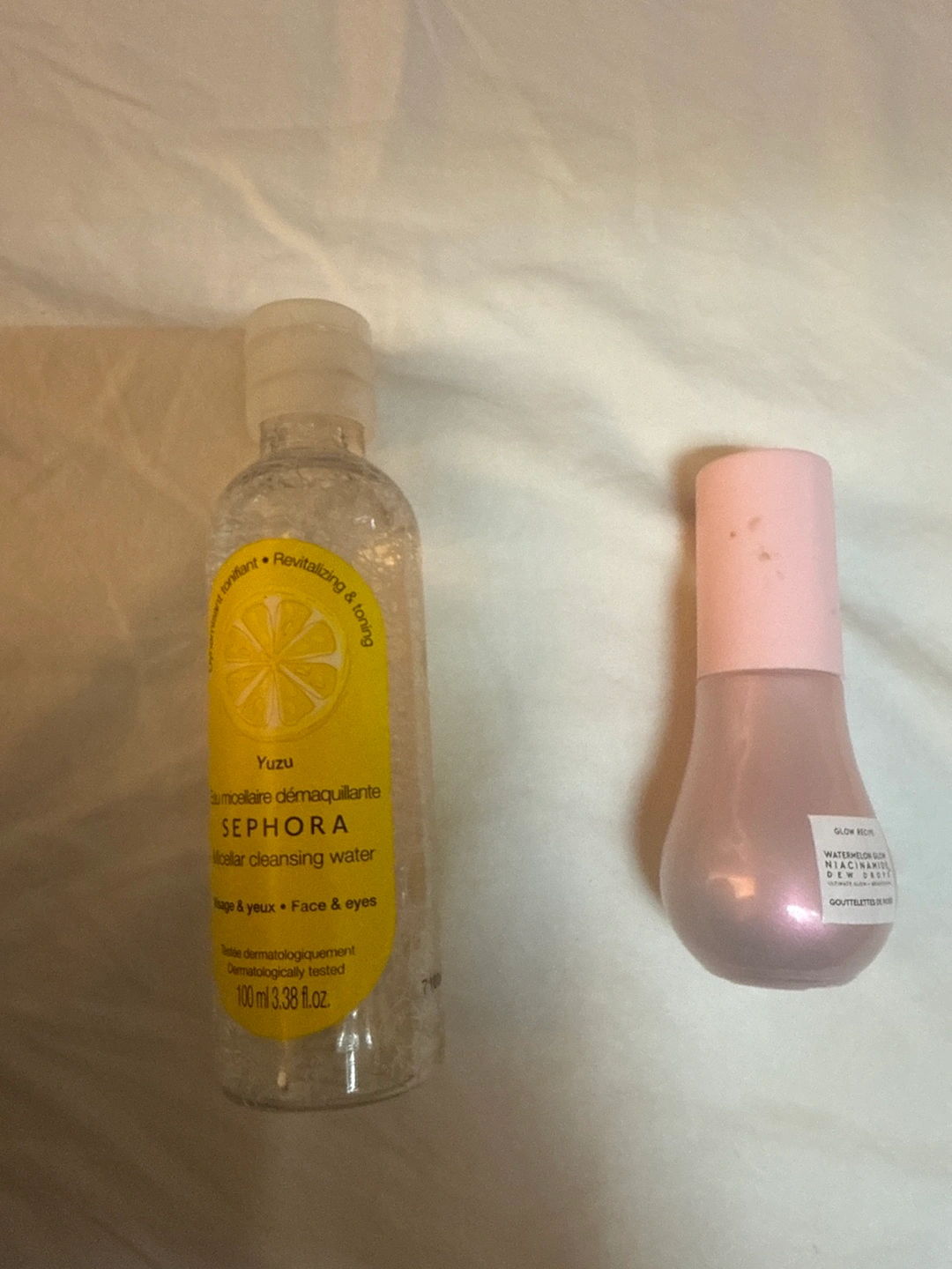 Two skincare products. Sephora micellar cleansing water, Yuzu scent. Glow Recipe Watermelon Glow Niacinamide Dew Drops. Both partially used. Cash and pick up.