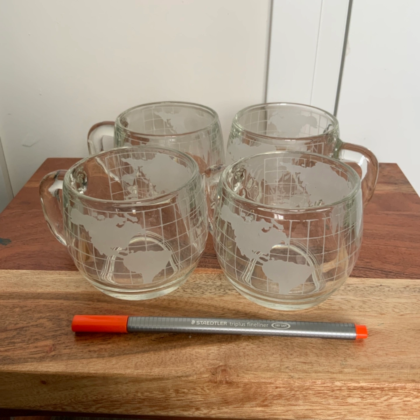 Four vintage glass mugs. Etched world map design. Clear glass. From the 70s. Part of a Nestle ad campaign that they had the best coffee worldwide.