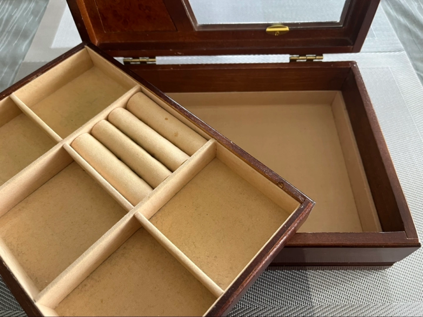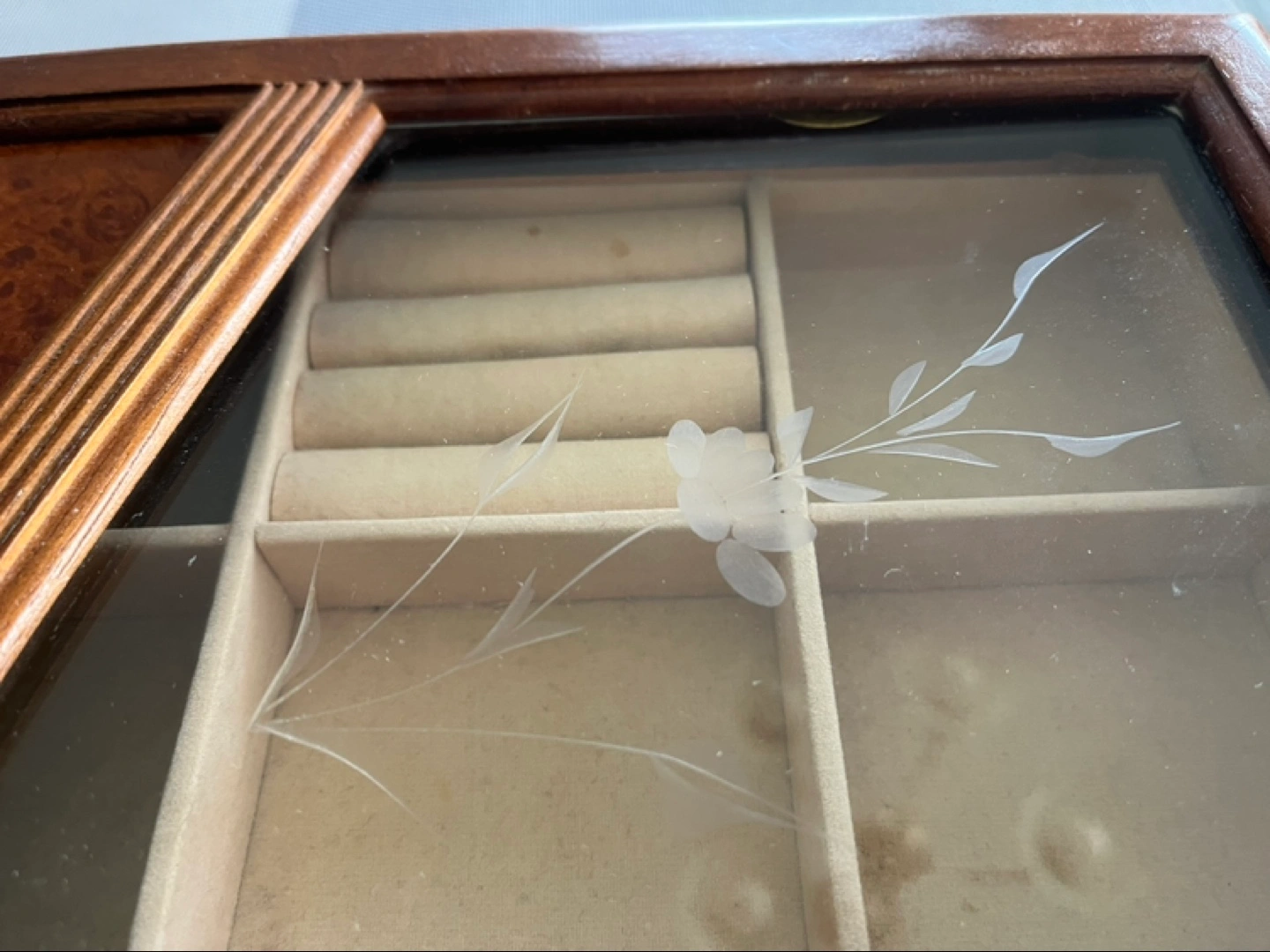 Wood and glass jewelry box, 2 layers. Pretty etched flower in glass. Bottom is one large undivided area. Top layer has compartments and ring holders for about 9+ rings.