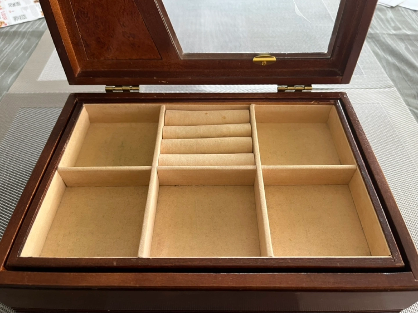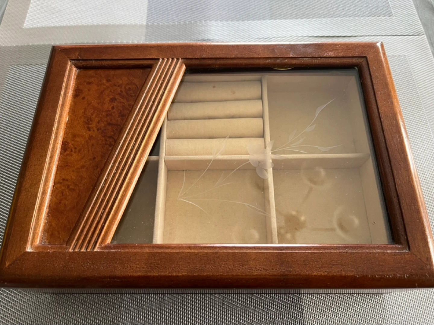 Wood and glass jewelry box, 2 layers. Pretty etched flower in glass. Bottom is one large undivided area. Top layer has compartments and ring holders for about 9+ rings.