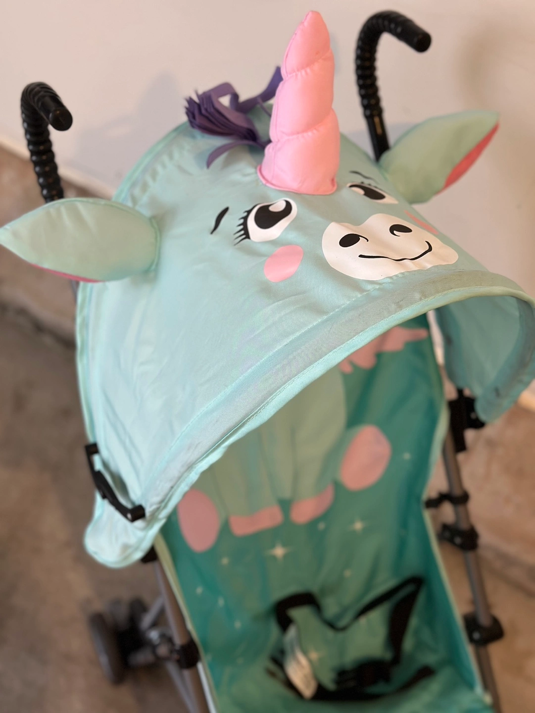 Lightweight, foldable stroller. Features a cute unicorn design on the canopy and seat. Great for travel or everyday use. Suitable for smaller children.