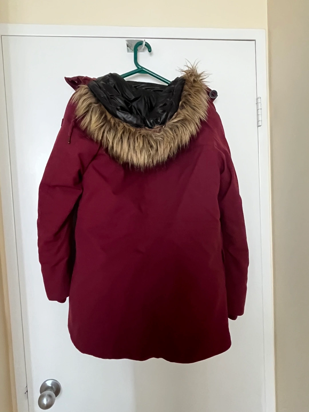 Warm winter parka. Burgundy colour. Faux fur-trimmed hood. Size M. Excellent condition.