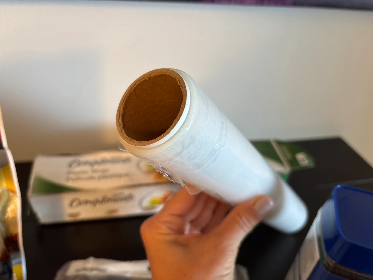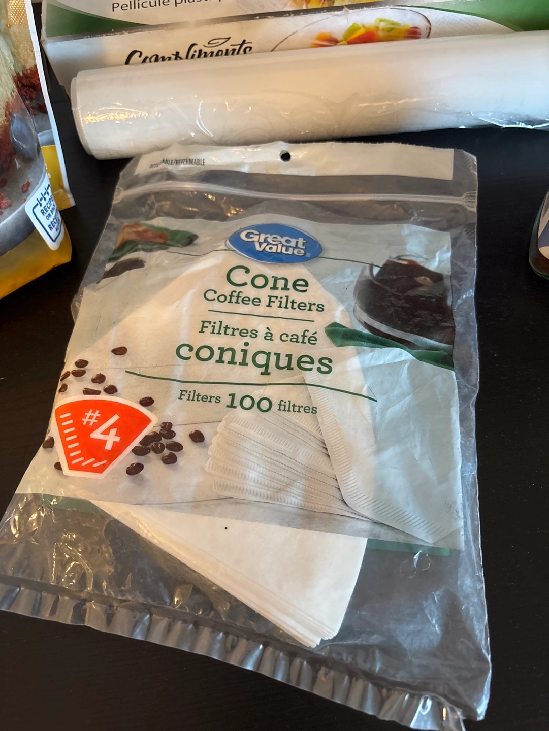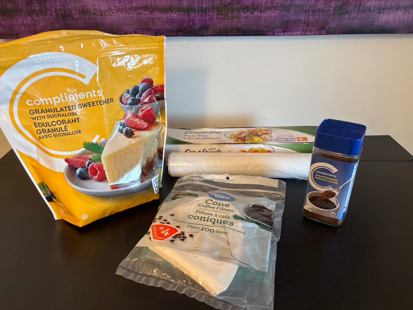 Large bag of Compliments granulated sweetener, roll of Compliments plastic wrap, Great Value cone coffee filters #4, and a instant decaf coffee. All opened.