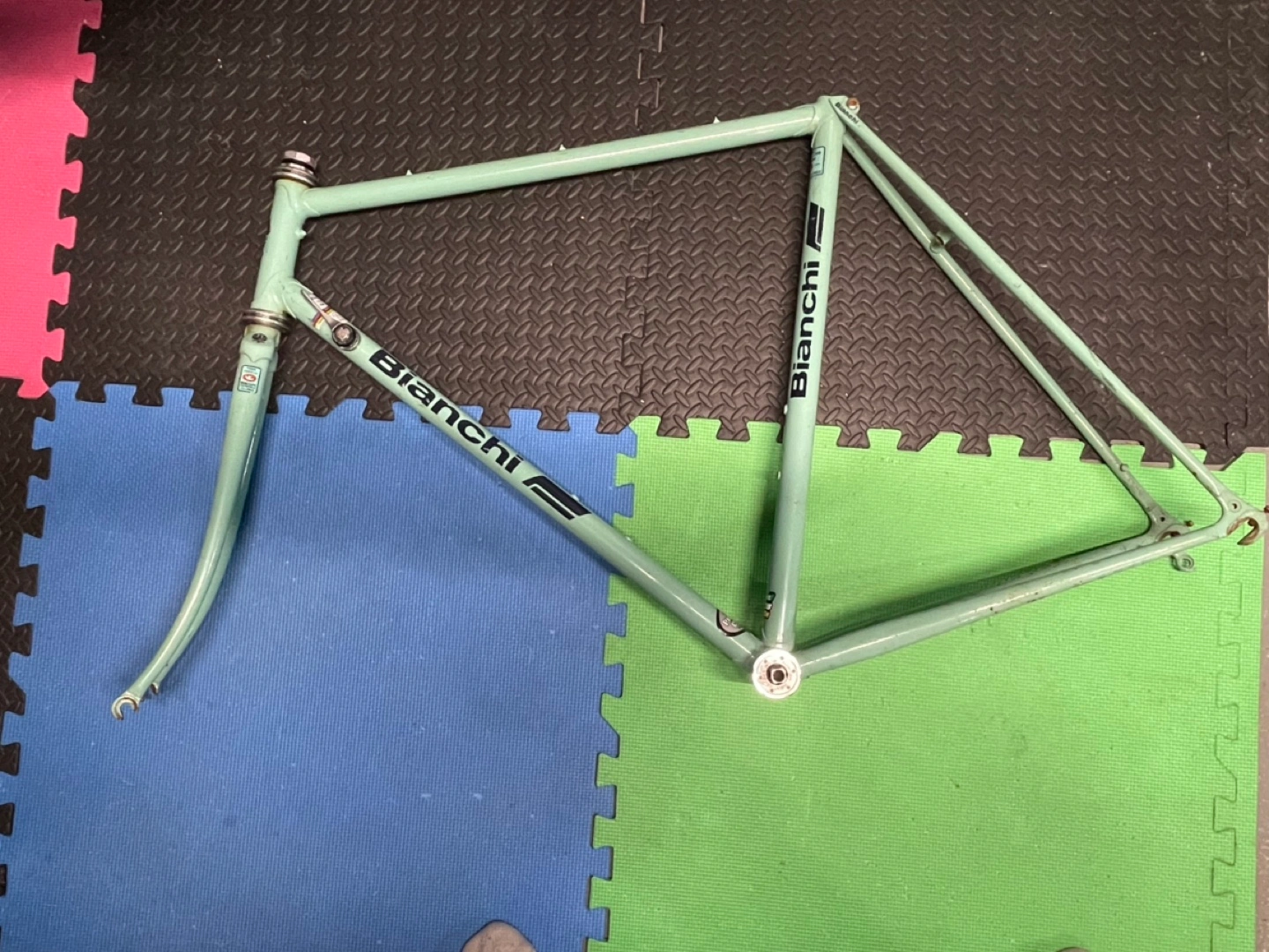 Fixie , commuter or restore to its former road bike glory . 55cm Bianchi road bike frame and fork in original iconic Celeste green . Model unknown. Shows some wear and tear ( patina )