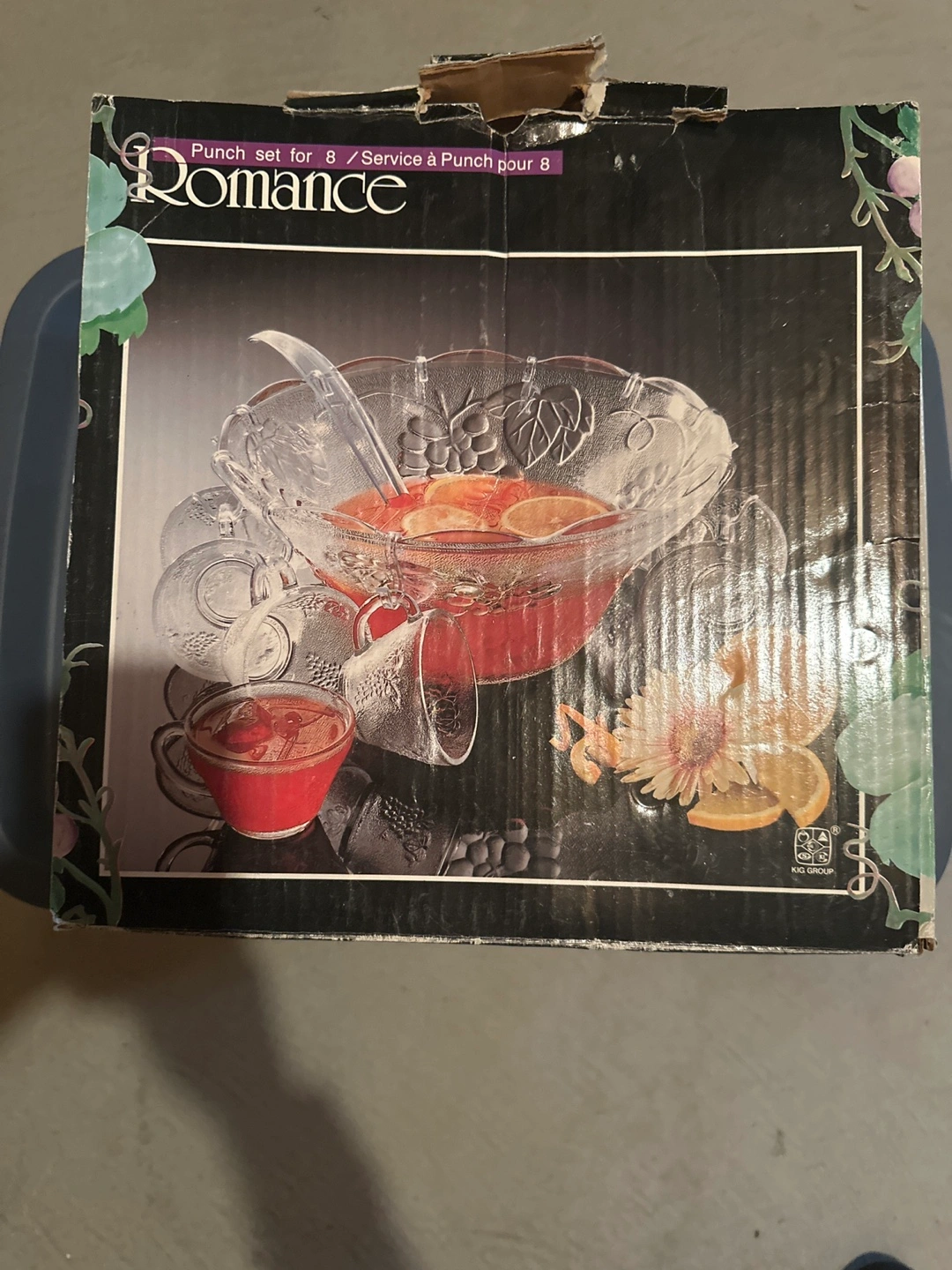 18-piece punch bowl set. Includes one 12 1/2 inch bowl, eight 6 ounce cups, and one plastic ladle. Made in Indonesia. Vintage.