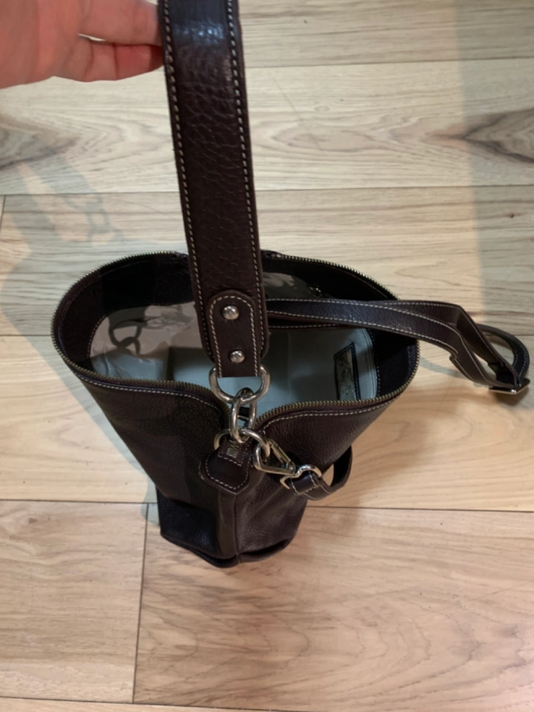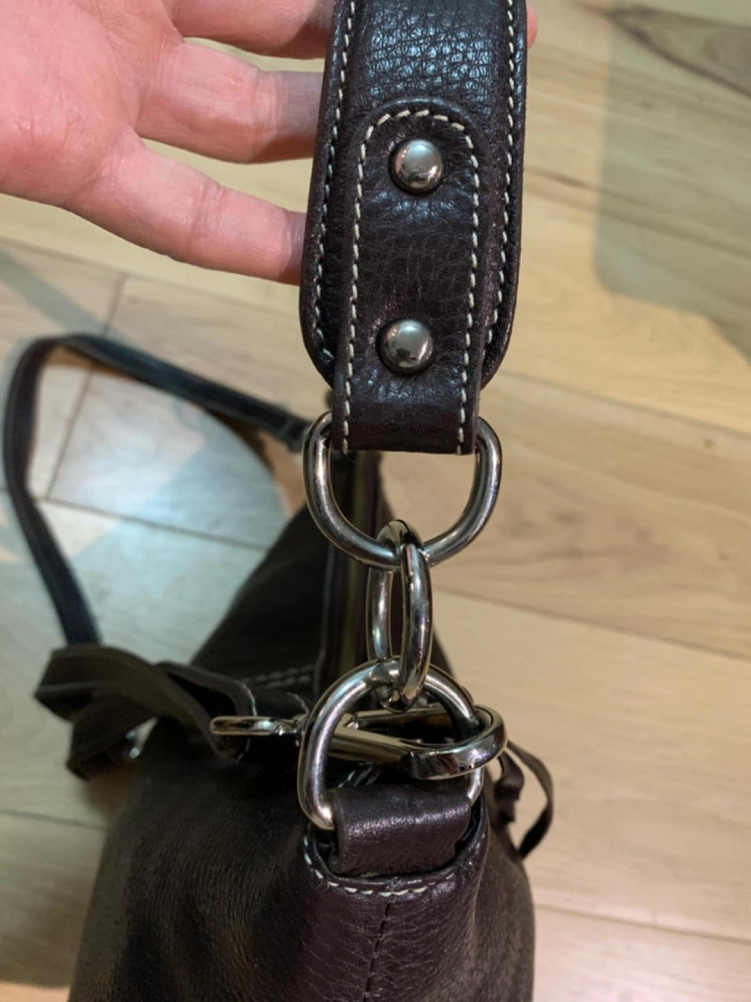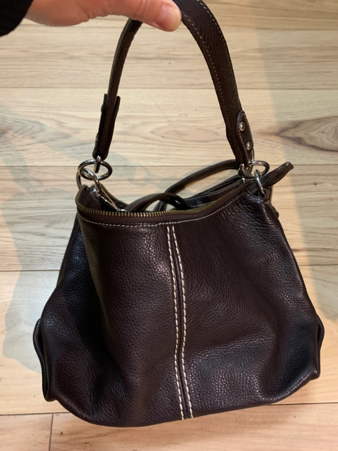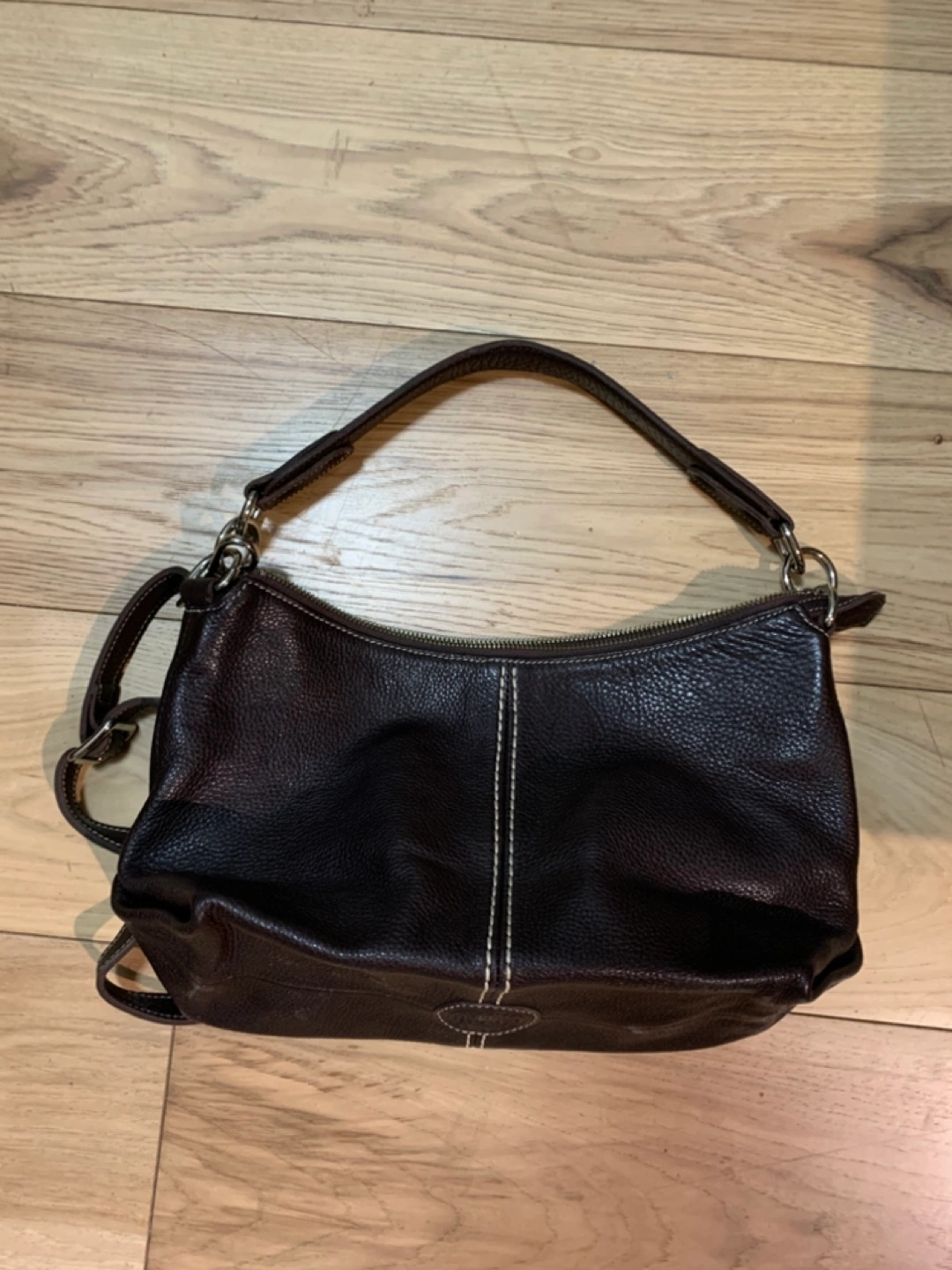 Brand new never used. Roots Dark brown leather shoulder bag. Adjustable strap. Zip closure. Interior pocket.