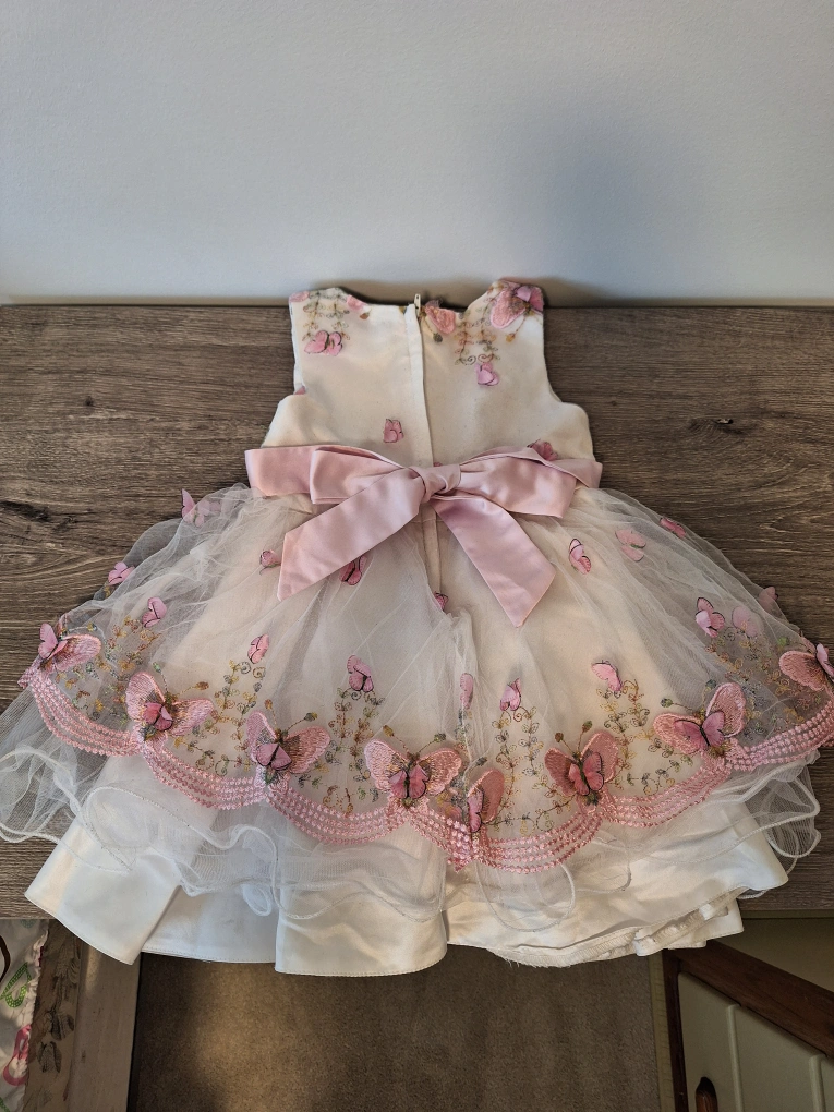 Beautiful occasion dress. Features pink butterflies and pearls. Layered tulle skirt. Pink satin ribbon. Sleeveless. Size not specified.