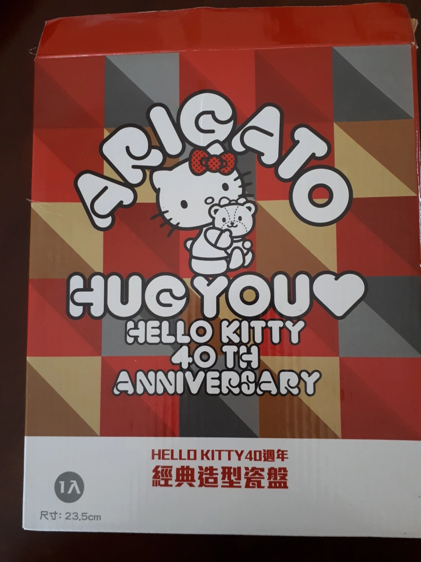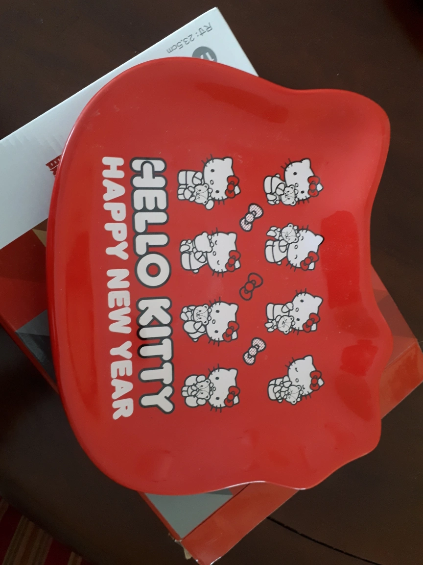 Four Hello Kitty themed plate. 40th Anniversary design. New in box. Collector's item. Red, black and white colours.