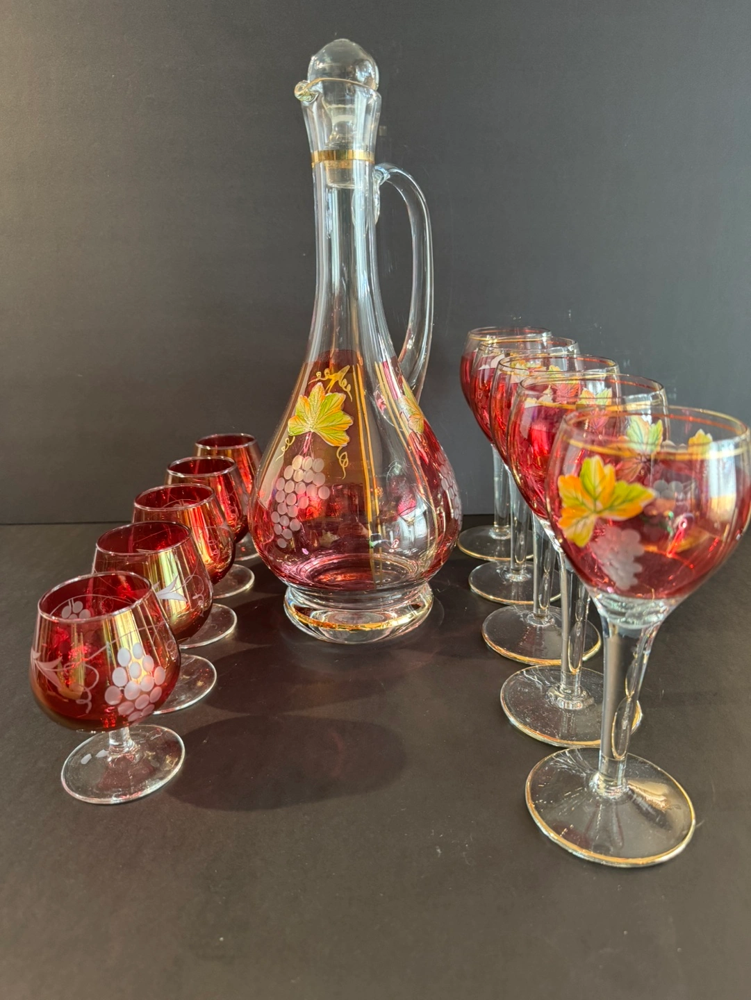 Beautiful vintage decanter set. Features six wine glasses and six cordial glasses. All pieces feature etched grapes and gold accents. Elegant and collectible.
