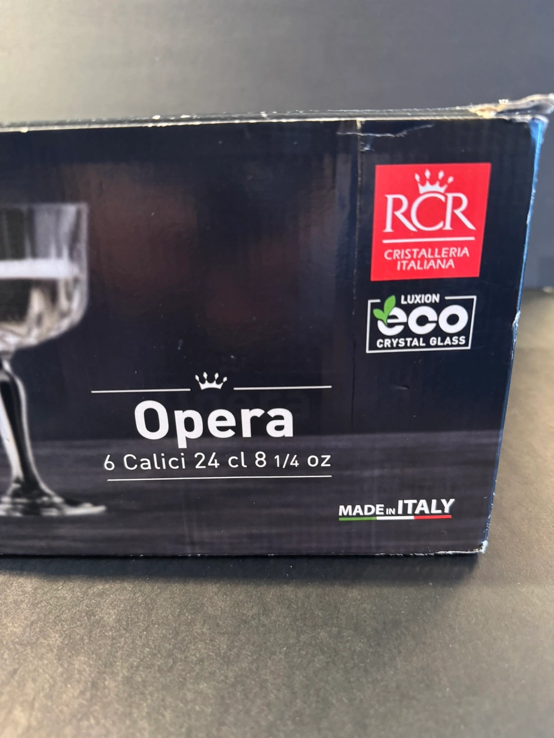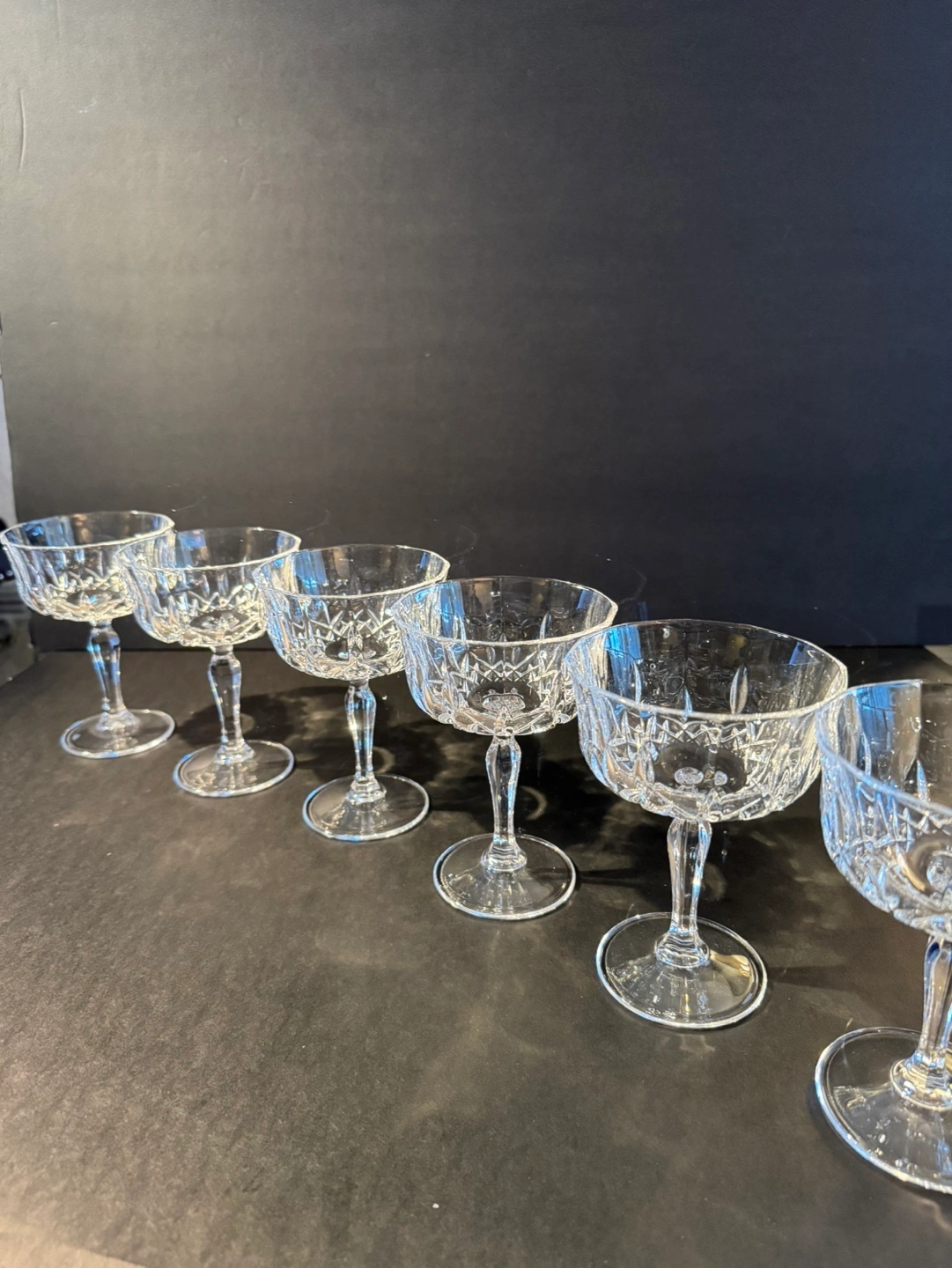 Elegant crystal champagne coupes. Set of six in original box. Beautiful cut crystal design. Perfect for entertaining.