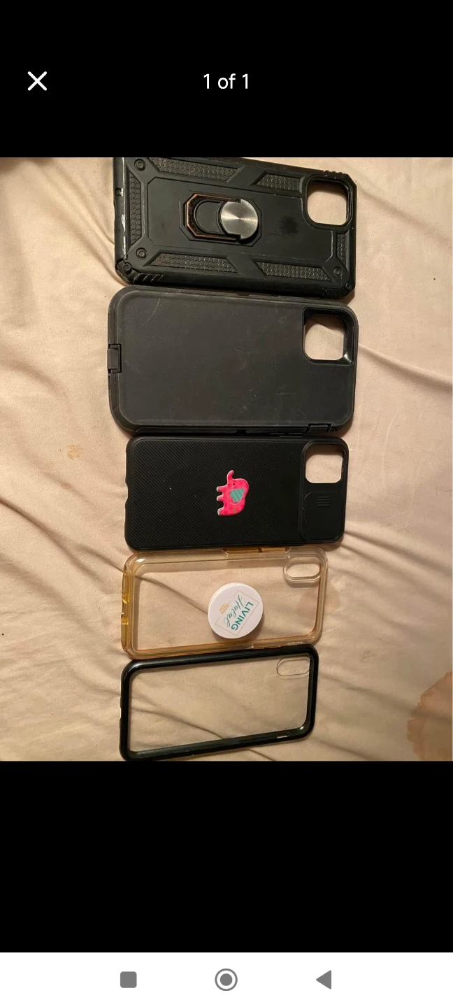 A collection of five assorted phone cases. Includes a heavy-duty case with a ring stand, a plain black case, a clear case with a pink elephant design, and a clear case with a pop socket. They appear to be for various iPhone models.