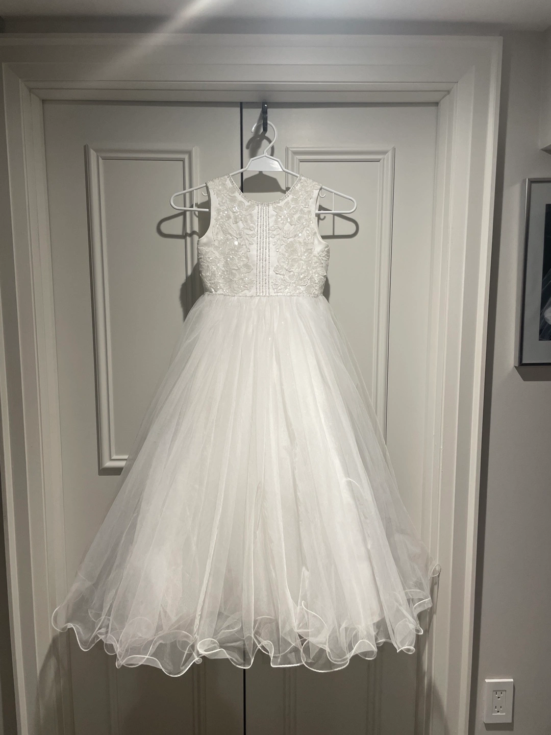 Beautiful white flower girl dress. Size 6L. Features delicate floral embroidery and beading. Sleeveless, A-line silhouette. Button closure at the back.