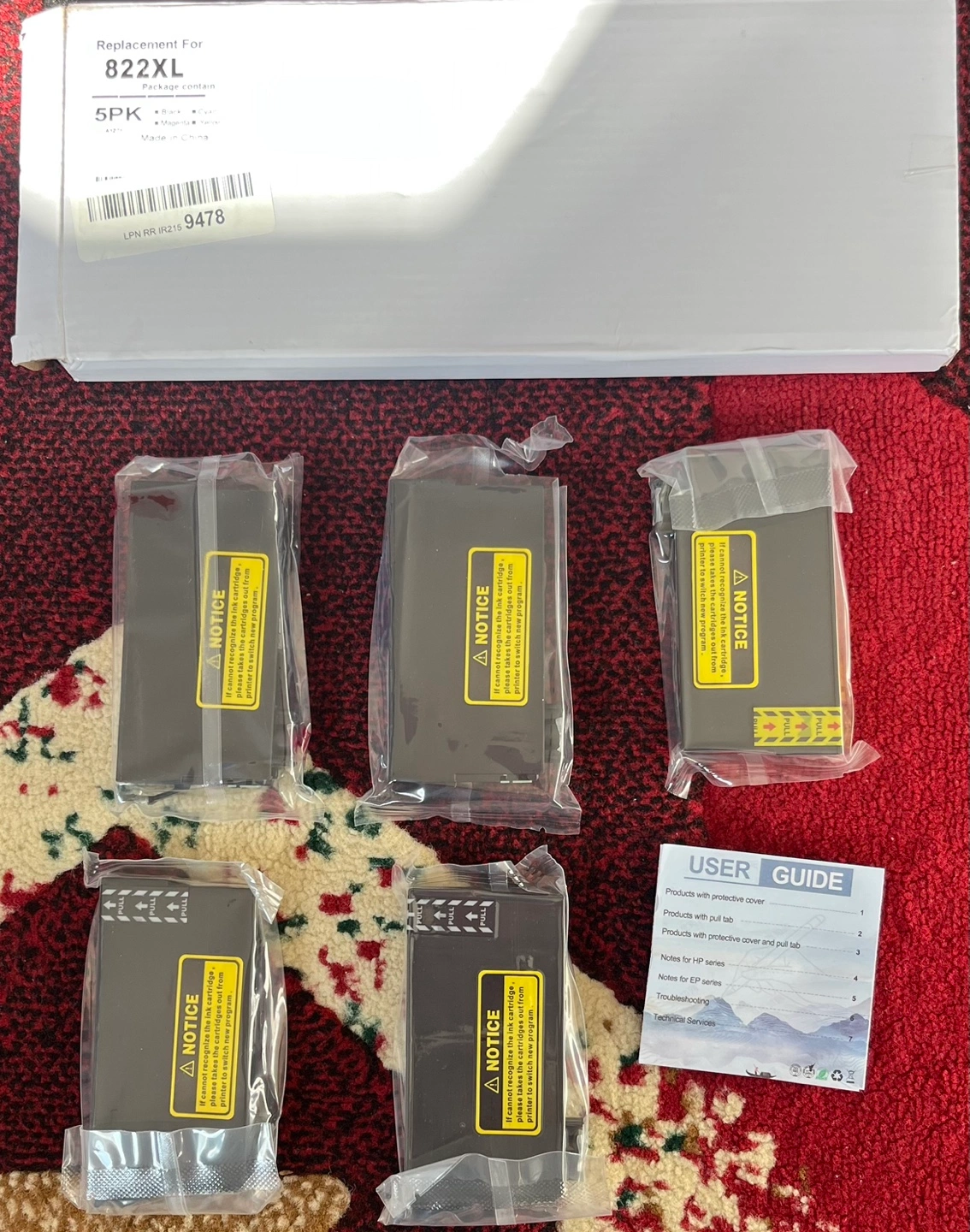 65Five new HP 822XL replacement ink cartridges. Individual packages. User guide included.