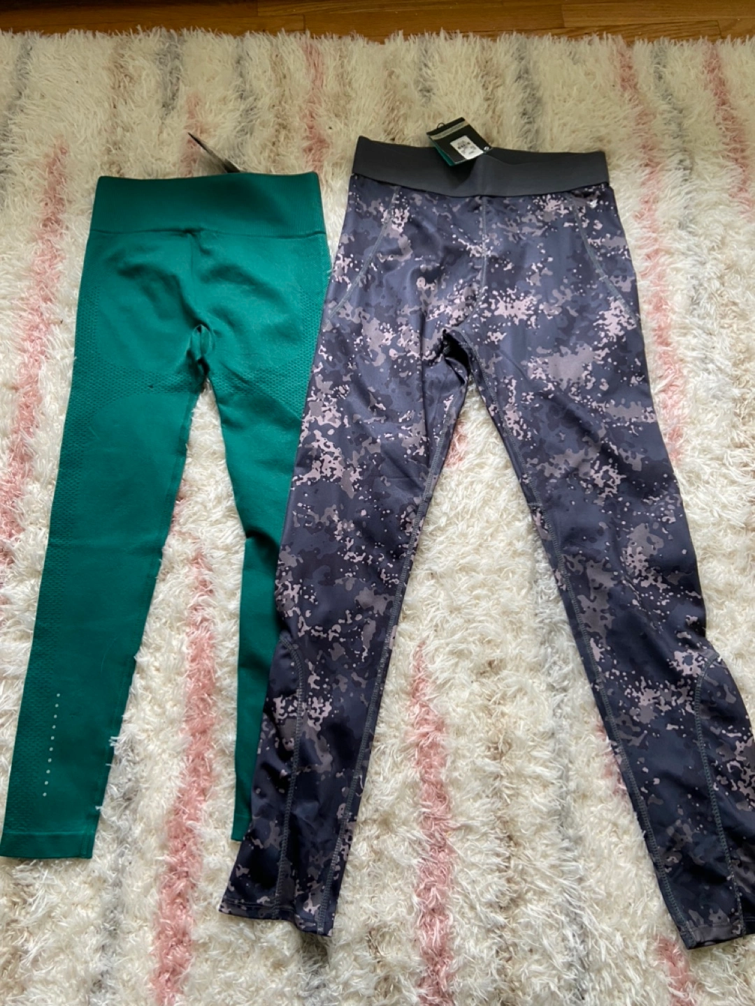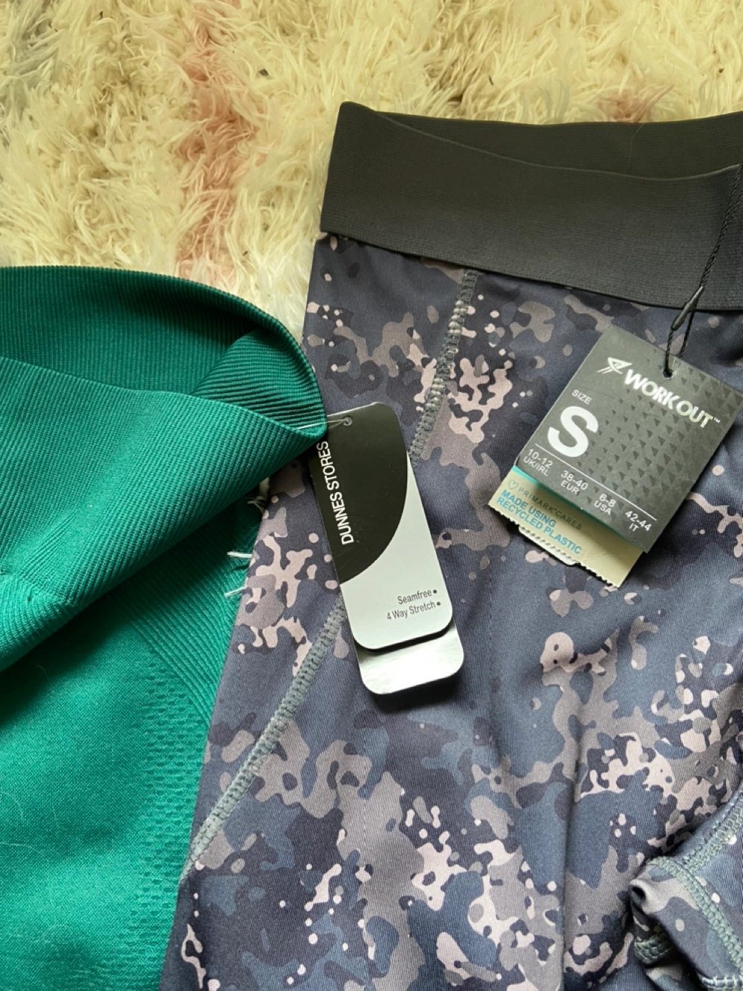 Two pairs of women's size small leggings. One pair is a teal green seamless legging from Dunnes Stores. The other pair is a camouflage print legging from Primark. Both are new with tags.