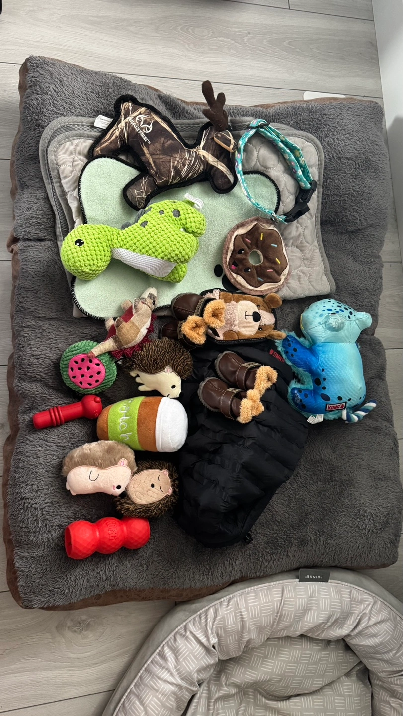 2 dog beds (round double sided grey & rectangular brown and grey plush removable washable cover), various dog toys included. Some toys are brands Outward Hound and Kong. Shoes, brand new collar, cooling pads, water and feeding bowl is also included.
