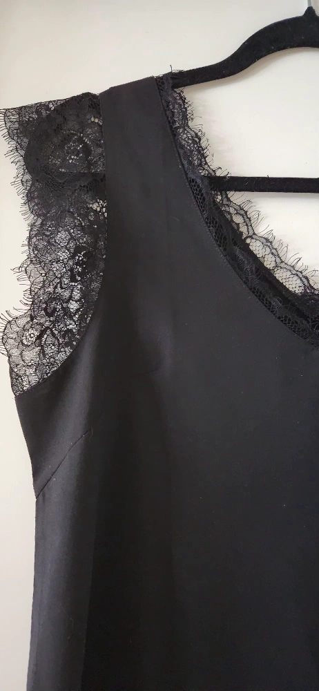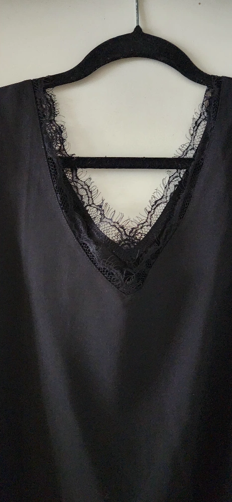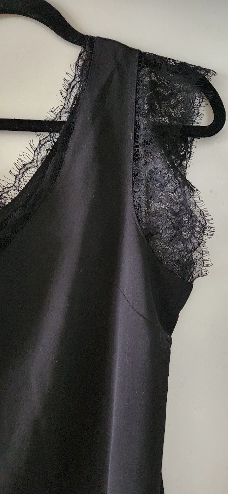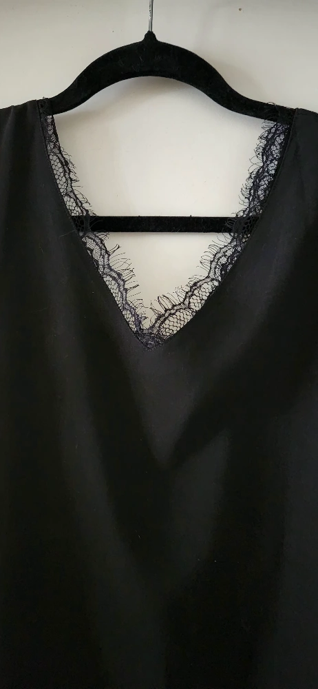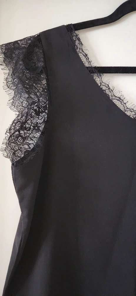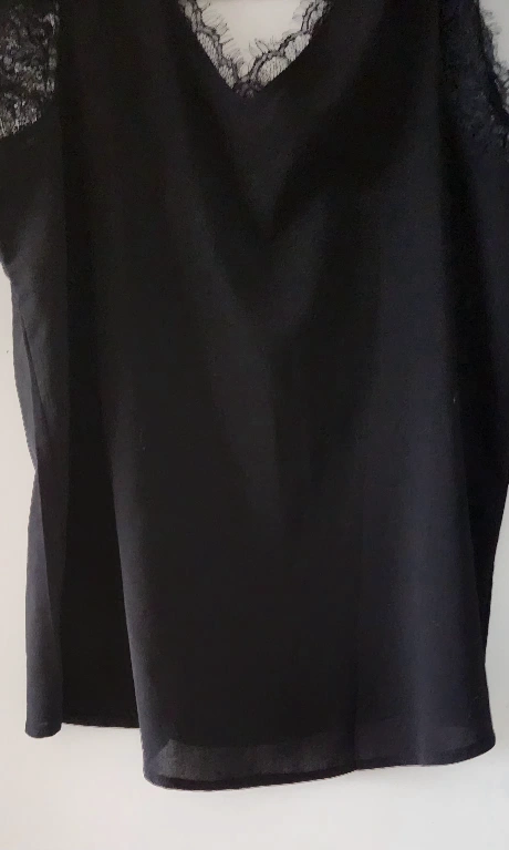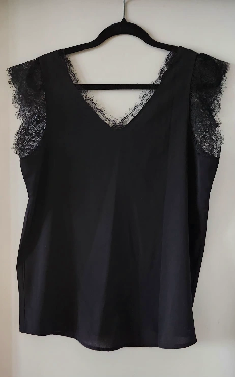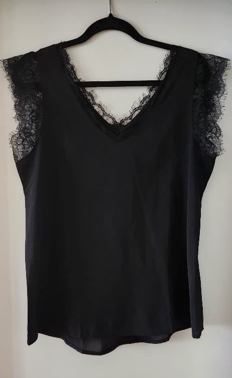 Beautiful black sleeveless V-neck top festuring feminine eyelash lace trim. Relaxed fit. Soft, flowy and lightweight fabric. Anti-wrinkle and comfortable for all day wearing. Made of 95% polyester and 5% spandex. Like new condition.