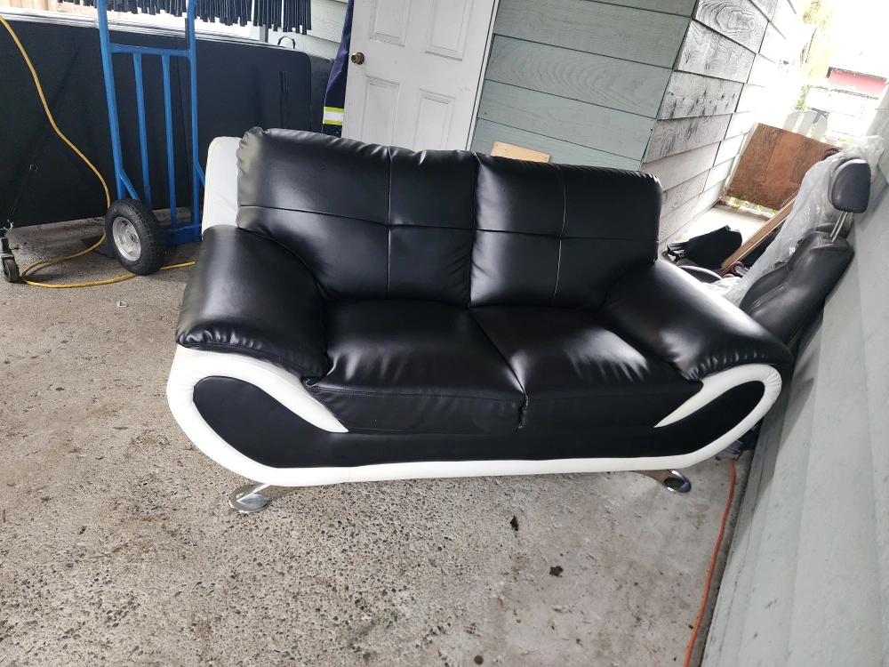 Stylish two-seater loveseat. Black and white leatherette upholstery. Curved design. Sleek silver legs. Great for small spaces.