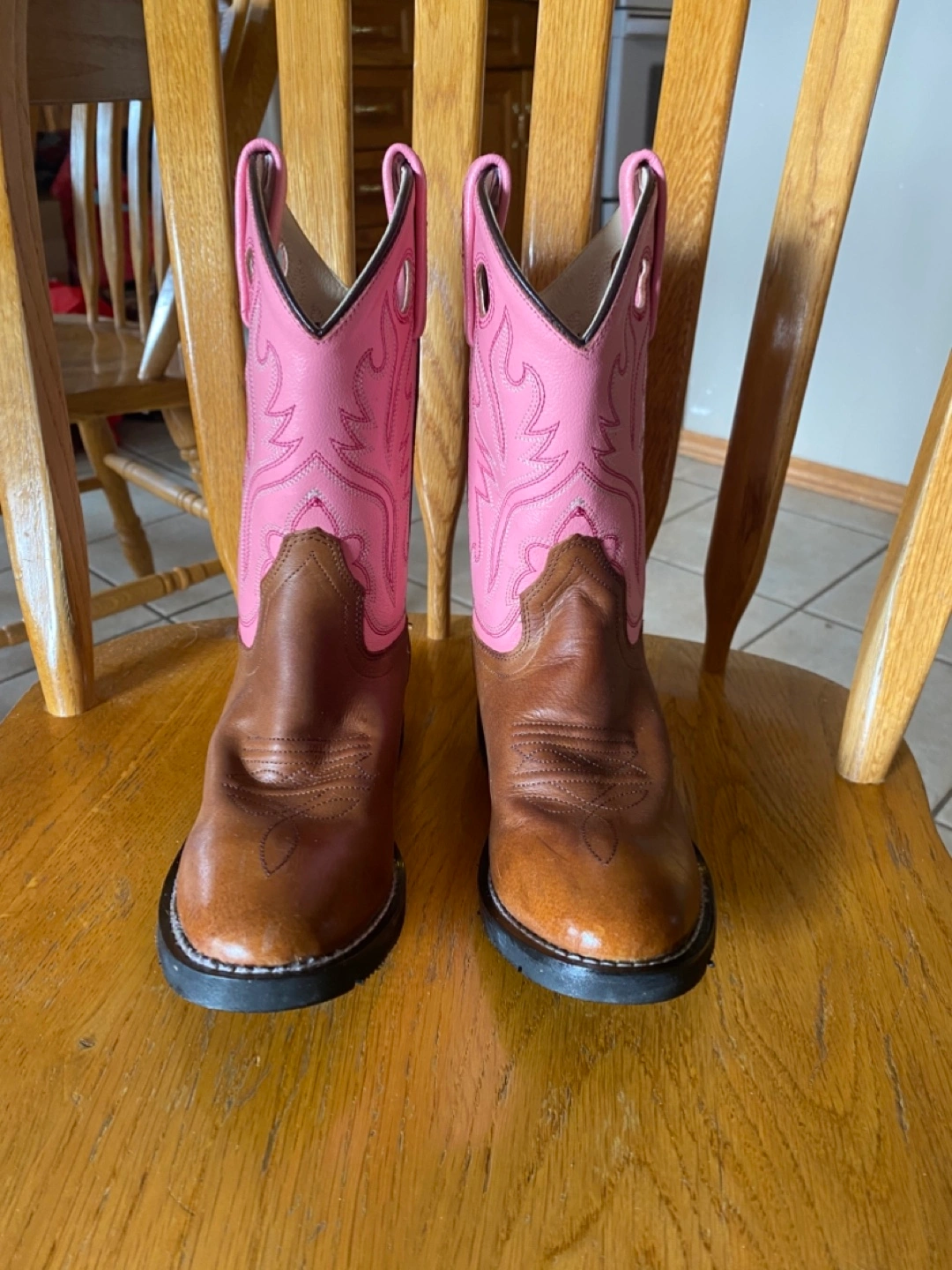 Girls' Old West cowboy boots. Brown leather with pink accents. Size 13 D Leather upper, made in India. Good pre-owned condition. Bought boots for granddaughter but she never wore them.