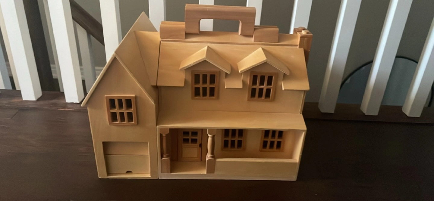 Adorable wooden dollhouse, opens to reveal multiple rooms. Features a garage, porch, and multiple windows. Portable design with convenient carry handle. Perfect for imaginative play.